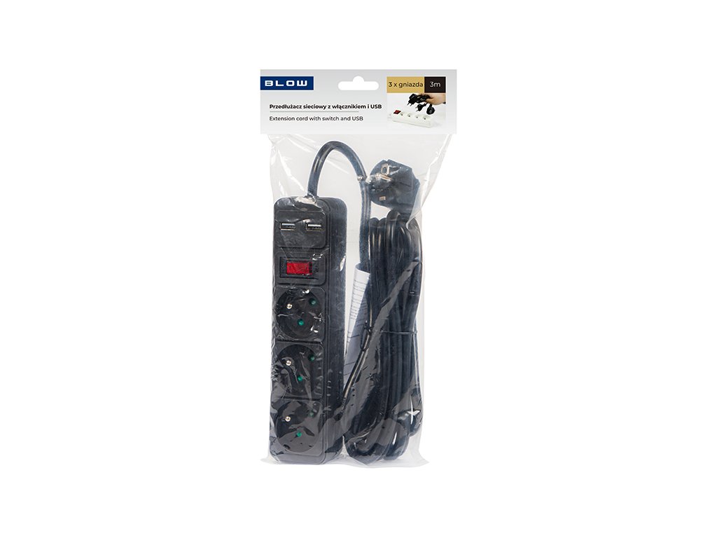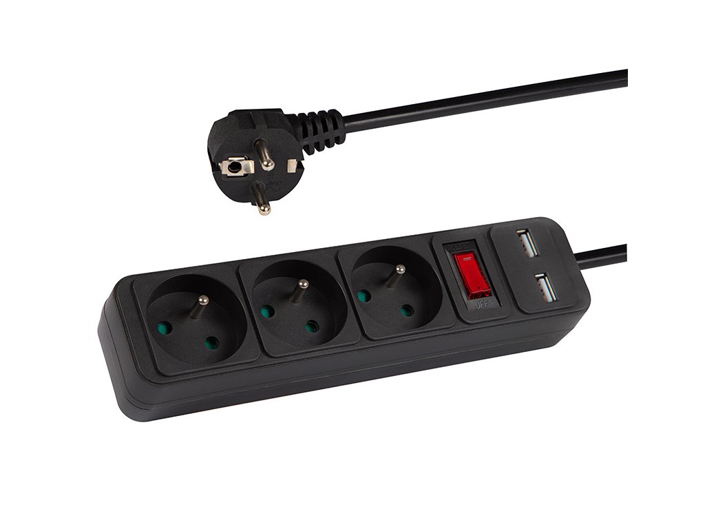 Podaljšek z USB, 3 vtičnice, 3m, črna