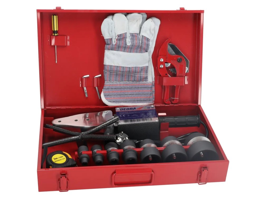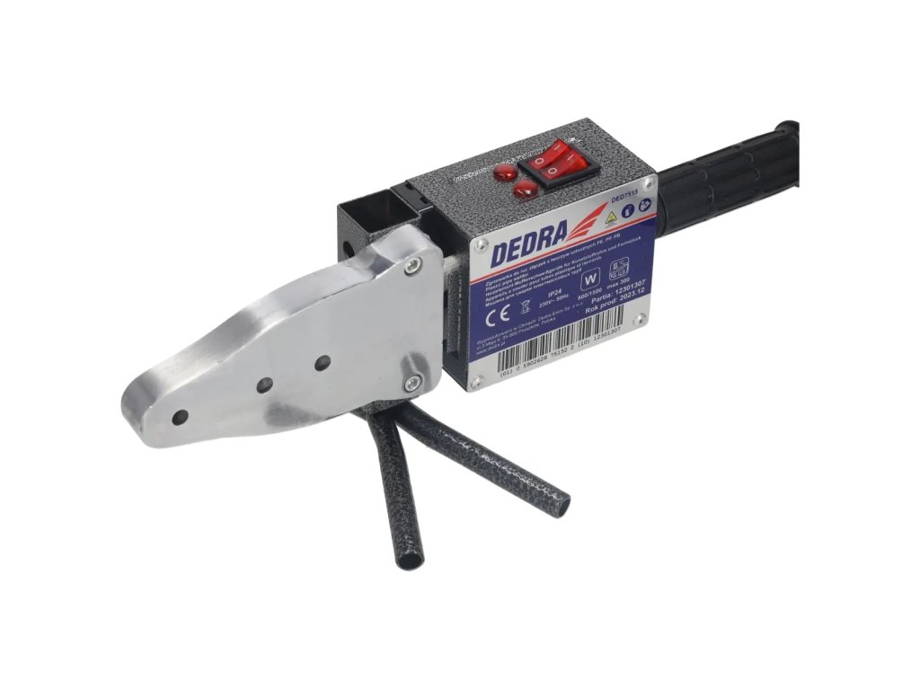 Varilnik DED7515 z močjo 800/1500 W se uporablja za varjenje polimernih cevi in ??fitingov (PE-polietilen, PP-polipropilen, PB-polibuten), ki se uporabljajo pri instalacijah za vodo in centralno ogrevanje. Stroj je opremljen z zamenljivimi grelnimi blazinicami, ki omogočajo hkratno ogrevanje notranje in zunanje površine združevanih delov. DED7515 ima gladko nastavitev temperature do največje temperature 300 °C.Lastnosti varilnika DEDRA DED7515: