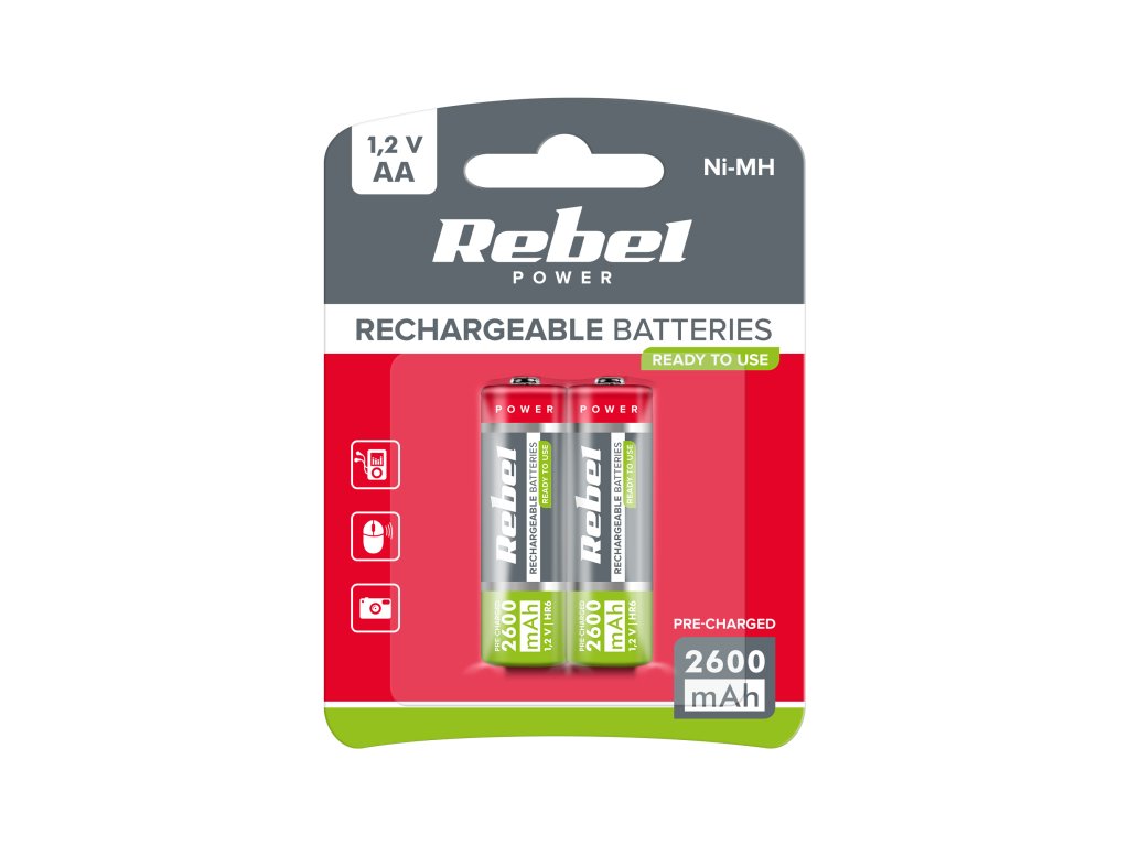 Polnilne baterije REBEL HR6 s kapaciteto 2600 mAh so zanesljiv vir energije za širok nabor elektronskih naprav. Zahvaljujoč uporabi nikljevo-metal-hidridne (Ni-MH) tehnologije te baterije zagotavljajo dolgotrajno delovanje in so odlična alternativa tradicionalnim baterijam za enkratno uporabo. Pakiranje vsebuje dve bateriji, zaradi česar so idealna izbira za vsakodnevno uporabo doma, v pisarni ali na potovanju.
