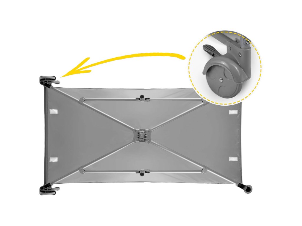 Kolesa omogočajo enostavno premikanje posteljice z mesta na mesto. Ko jo postavite, lahko kolesa zaklenete, da varno ostanejo na svojem mestu.