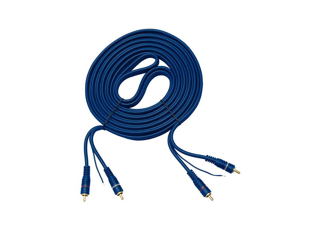Konektor 2xRCA, zaključen na obeh straneh z dvema pozlačenima RCA konektorjema, skupaj z nadzornim kablom za avdio sisteme v avtomobilih.