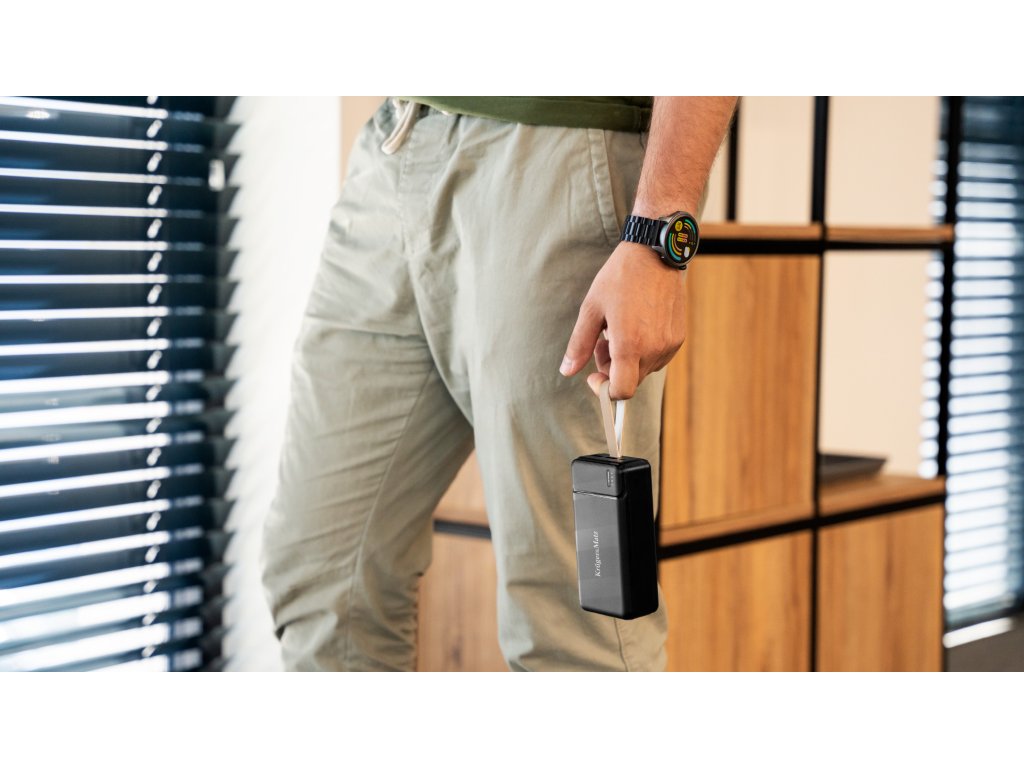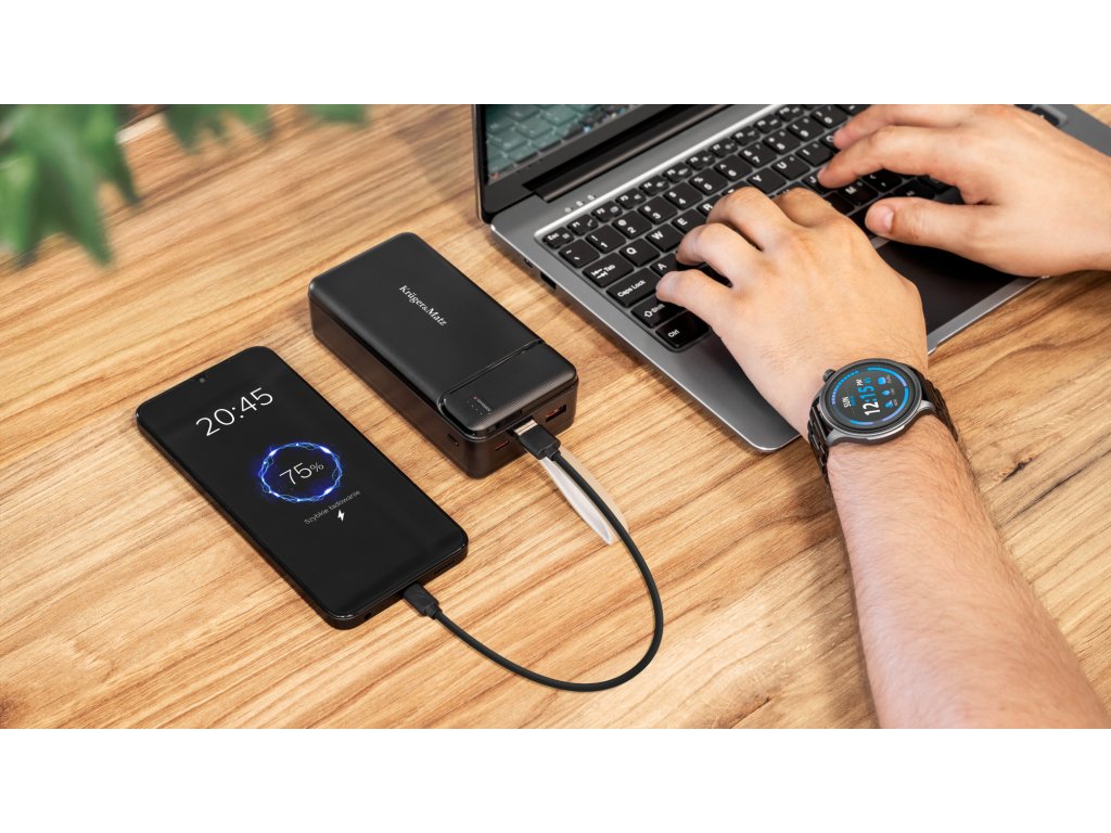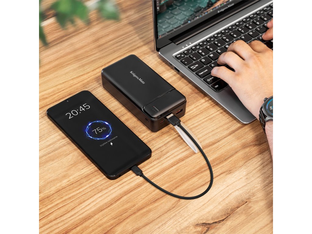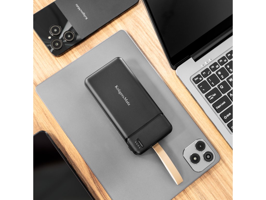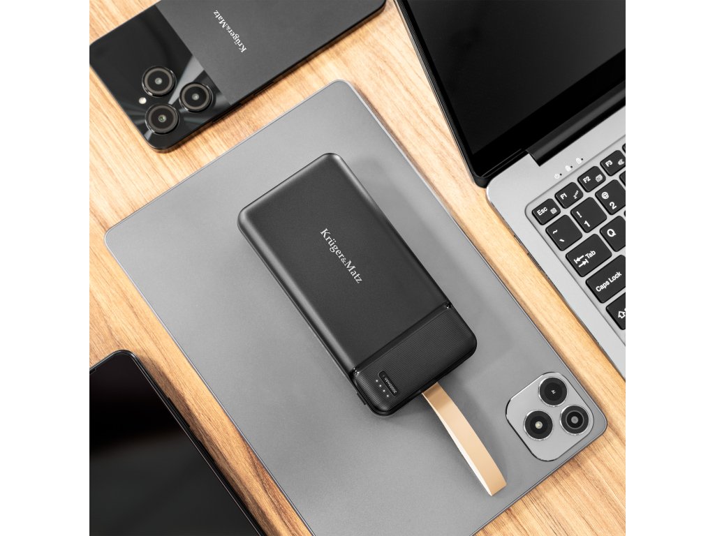 Power bank Kruger&Matz je zasnovan z mislijo na maksimalno funkcionalnost. Naprava omogoča polnjenje do treh naprav hkrati. Ne glede na to, ali ste na potovanju, na srečanju ali kampiranju, lahko hkrati napajate telefon, tablico in slušalke. To je udobje, ki vam omogoča prihraniti čas.