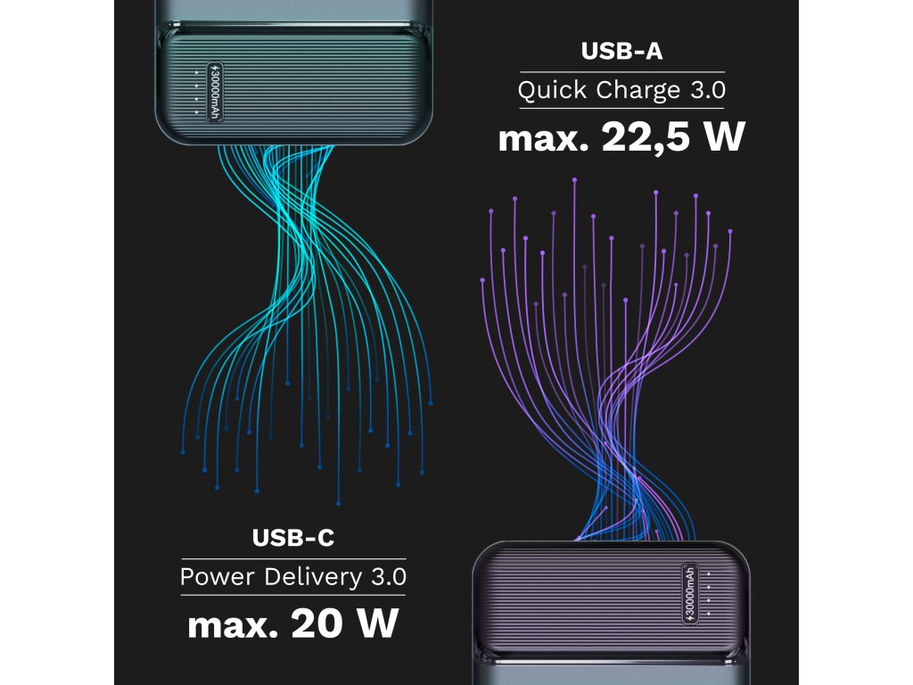 Opremljen s tehnologijama hitrega polnjenja Quick Charge (QC) in Power Delivery (PD), power bank Kruger&Matz ponuja bliskovito obnovitev energije tako za polnjene naprave kot tudi za sam power bank. USB-C vhod omogoča hitro polnjenje z močjo do 20 W, USB-A vhodi pa omogočajo celo 22,5 W. S tem prihranite čas in vaše naprave se vračajo v polno pripravljenost v rekordnem času.