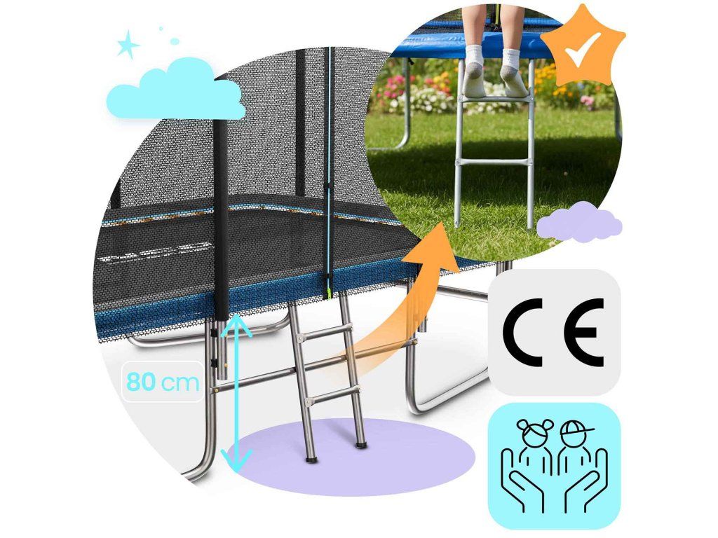 Lestev s pritrdilnim sistemom – trdna, kovinska in ustrezno nagnjena. Olajša varno plezanje gor in dol, še posebej otrokom. Zaradi premišljenega naklona omogoča udoben dostop do trampolina.