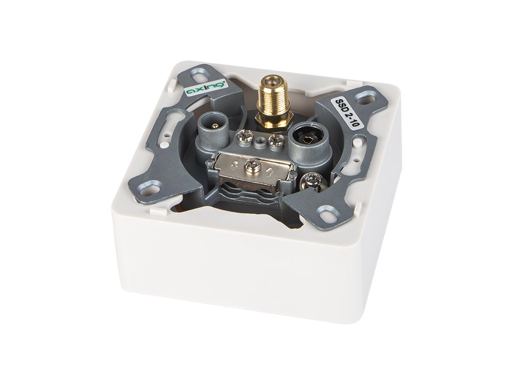 Naročnikova vtičnica SSD2-10 prehodna z ohišjem in pozlačenim SAT izhodom. Namenjena za instalacijo zemeljske, satelitske in radijske signalne televizije. Možnost montaže tako na površini kot pod ometom, zahvaljujoč enostavni demontaži "škatle". Vtičnica se odlikuje z zelo dobrimi tehničnimi lastnostmi, izjemno trdno kakovostjo izdelave in dolgo življenjsko dobo.