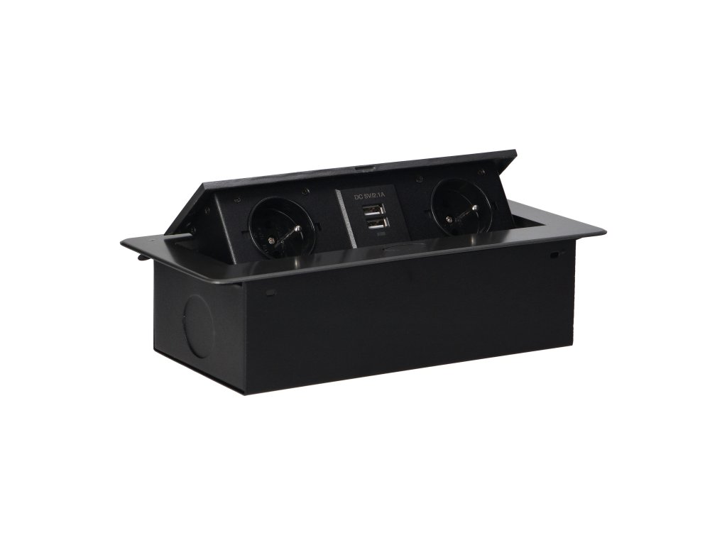 Set dveh ozemljenih vtičnic z zaščito pred prenapetostjo v kombinaciji z dvema USB polnilnikoma. Set je vgrajen v ohišje, ki ga je mogoče integrirati v mize, delovne površine in pisalne mize. Lahko ga namestite vertikalno ali horizontalno, kar omogoča udoben dostop do električnih vtičnic. Zahvaljujoč ploščati rob (samo 2 mm) pokrov z vtičnicami popolnoma zategne v površino npr. mize in ne ovira pri čiščenju. Priporočljiv kabel OWY 3 × 1,5 mm? (ni priložen). Barva - grafitna.Tehnična specifikacija