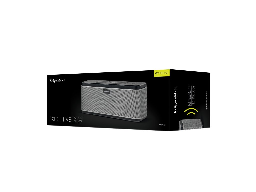 Kruger&Matz Executive je visokokakovosten prenosni zvočnik Bluetooth, opremljen z dvema močnima pretvornikoma 12,5 W, ki vas bo očaral z neverjetnim zvokom in jasnostjo zvoka. Poleg tega uporaba tehnologije MaxxBass povečuje dinamiko nizkih tonov in vas bo večkrat presenetila. Da se brezžično povežete z drugo napravo, Executive uporablja tehnologijo Bluetooth 4.0 z največjim dometom 30 m ali funkcijo NFC, če pa želite poslušati glasbo, shranjeno na drugem mediju, lahko uporabite vhod AUX. Nedvomno so prednosti tudi vgrajeni mikrofon, ki Executive spremeni v prostoročni komplet, in izhod AUX, ki ga lahko uporabite za priključitev drugega zvočnika. Omeniti velja tudi vrata USB, s katerimi lahko napravo uporabite kot power bank.