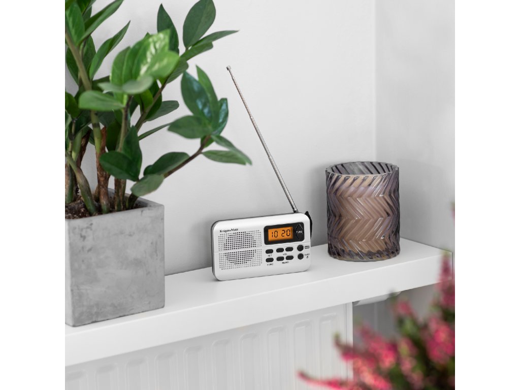 KM 819 je prenosni radio, ki ga zaradi kompaktnih dimenzij zlahka spravite v torbico, nahrbtnik ali celo večji žep. Zato ga lahko brez težav uporabite kot majhen turistični radio, ki ga lahko vzamete s seboj povsod, da popestrite čas z najljubšimi FM postajami.