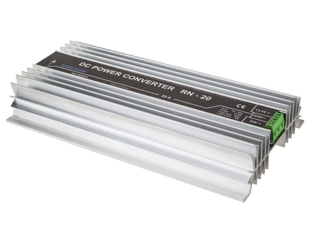 Vhodna napetost: 20 - 30 V Izhodna napetost: 13 V ±1 V Največji trenutni izhodni tok <2 min: 20 A Največji stalni izhodni tok: 6 A Pretvornik ima zaščite: preobremenitveno, kratkostično, prenapetostno ---------- Dimenzije (DxŠxV): 250 x 130 x 40 mmVhodna napetost: 20 - 30 V