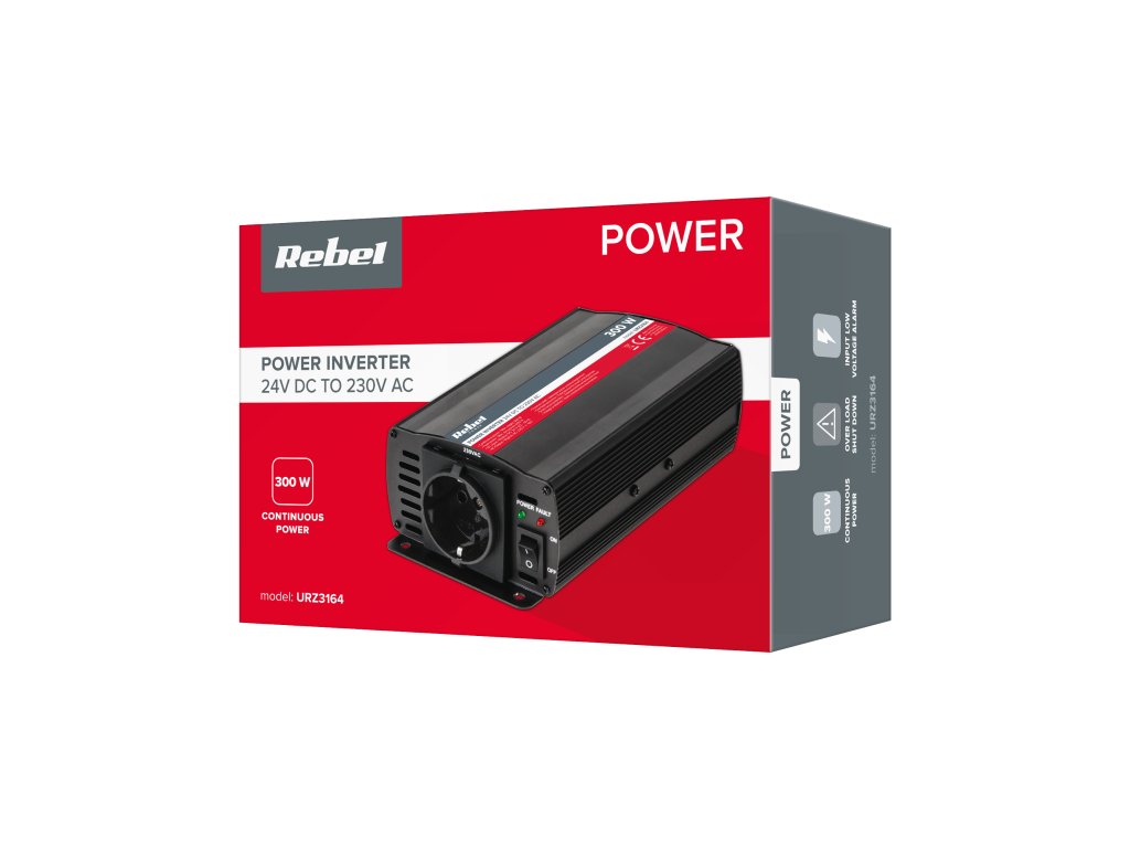 Pretvornik REBEL 24V/230V z močjo 300W je zanesljiva naprava, zasnovana za napajanje električnih naprav v vozilih z 24V instalacijo. Odlično se obnese v tovornjakih, avtodomih in drugih vozilih, kjer je dostop do standardne napetosti 230V nujen med potovanjem.