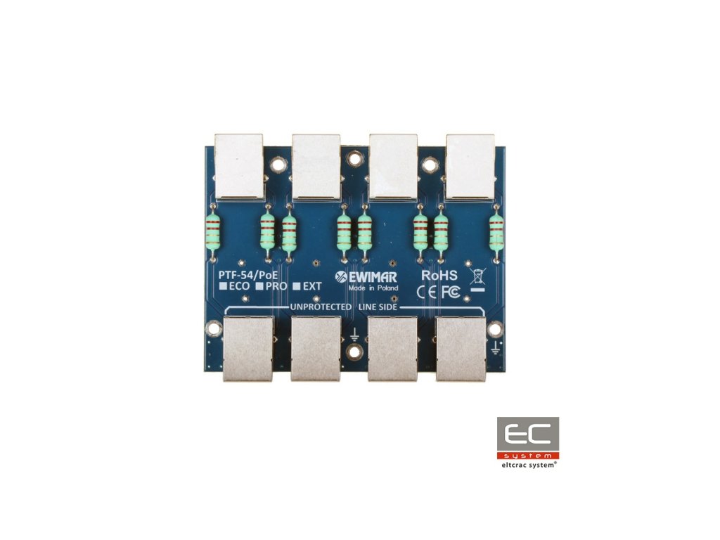 PTF-54-EXT/PoE je štirikanalni modul, ki je odgovoren za zaščito pred prenapolnjenjem, na primer IP kamer, LAN prestreznikov, usmerjevalnikov, WiFi dostopnih točk in drugih naprav, ki delujejo v omrežjih 100Mbit. Naprava je združljiva s kabli UTP in FTP kategorije 5, 5e in 6. Modul je namenjen omrežjem 10Base-T, 100Base-T. PTF-54-EXT/PoE je namenjen zaščiti naprav, nameščenih zunaj stavb, kot tudi na drogih in kovinskih konstrukcijah. Modul uporablja tehnologijo MOSFET, ki omogoča zelo visoko raven zaščite tako pred prenapolnjenjem kot tudi pred nenadnimi spremembami potencialnih razlik. Odlični parametri prenosa podatkov in visoka odpornost proti udarcem so doseženi z uporabo PCB plošč z zelo visoko vsebnostjo bakra, natančnim vodnikom vezij in aplikacijo inovativnih komponent. Na obeh straneh (zaščiteni - DEVICE in nezaščiteni - LINE) so bile uporabljene vtičnice RJ-45, kar omogoča, da se moduli povezujejo z drugimi patch paneli, ki služijo kot zaključek LAN kablov. Naprava ne sme biti uporabljena v povezavi s standardnimi patch paneli z vtičnicami LSA (Krone), ker je odpornost njihovih vezij na udarce prenizka in se lahko poškodujejo v primeru prenapolnjenja. Kot zaključek LAN kablov se najbolje uporabljajo patch panele z moduli tipa Keystone. Za montažo je treba uporabiti namensko osnovo PTU/PTF-5-RACK, ki sprejme največ 4 moduli različnih vrst, ali pa vsebuje en modul ohišja PTF-5-BOX. Ozemljenje naprave se izvede preko montažnih vijakov ohišja Rack, kar omogoča enostavno vzdrževanje, zamenjavo ali širitev modula. Povezava se izvede s priloženim kablom, ki je pritrjen na skupno ozemlje ohišja.