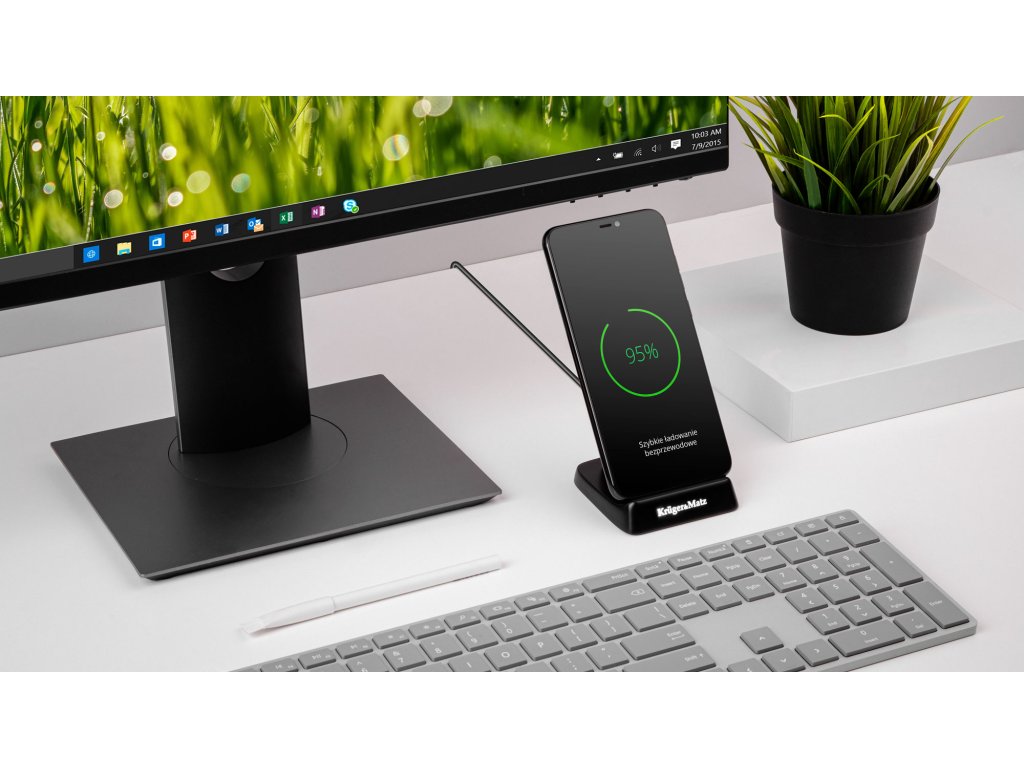 Nikoli ni bilo tako enostavno in udobno polniti pametnega telefona. Z indukcijskim polnilnikom Kruger&Matz to storite brezžično – dovolj je, da telefon položite na stojalo in postopek se bo začel samodejno. Polnilnik je združljiv z vsemi napravami, ki uporabljajo tehnologijo Qi.Dodatna oprema je opremljena s funkcijo hitrega polnjenja, ki ta proces precej pospeši. Poleg tega posebna konstrukcija omogoča polnjenje telefona ne samo v pokončnem, ampak tudi v ležečem položaju. To pomeni, da lahko med polnjenjem gledate filme in vas ni treba skrbeti, da bi se baterija izpraznila med gledanjem. Indukcijski polnilnik Kruger&Matz se ponaša tudi s stilskim videzom, obogatenim s praktično rešitvijo – nedrsečimi nogicami – da boste prepričani, da se vaš polnilnik ne bo zdrsnil iz mize ali omarice.