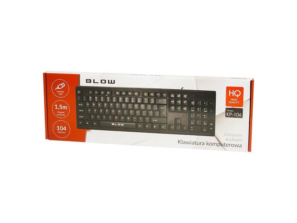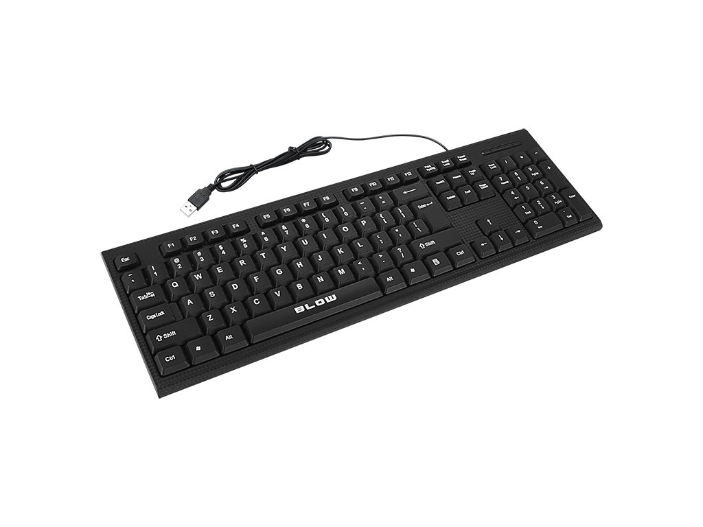 Ožičena tipkovnica znamke Blow z USB vmesnikom, izdelana iz visokokakovostnih materialov s povečano odpornostjo na vlago. Uporaba najbolj priljubljene razporeditve tipk QWERTY in dodeljena številska tipkovnica omogočata svobodno pisanje. Uporabljene zložljive nogice omogočajo nastavitev kota nagiba tipkovnice glede na uporabnikove preference.