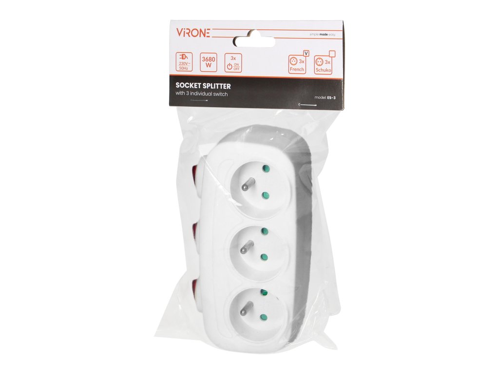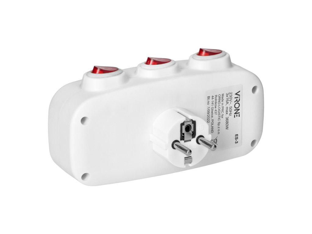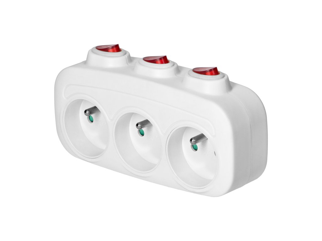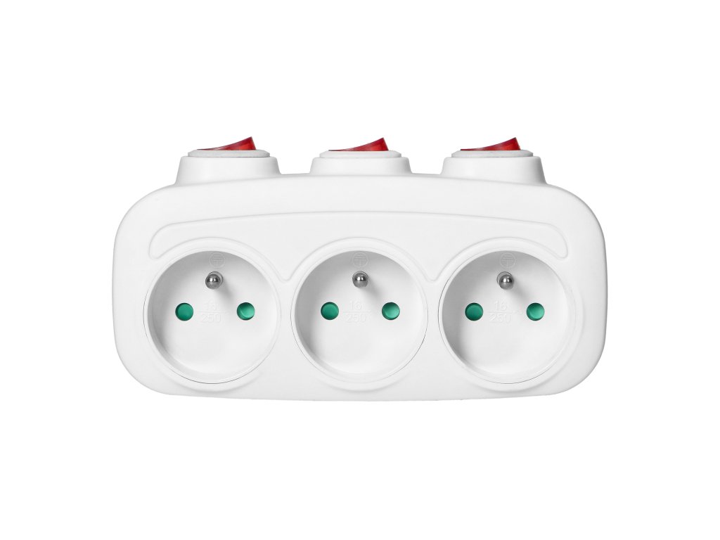 - Tri dvonamenske vtičnice (2P+E): Razdelilnik vtičnic ponuja tri vtičnice z zaščitnim priključkom, kar ga naredi idealnega za priključitev več naprav hkrati.