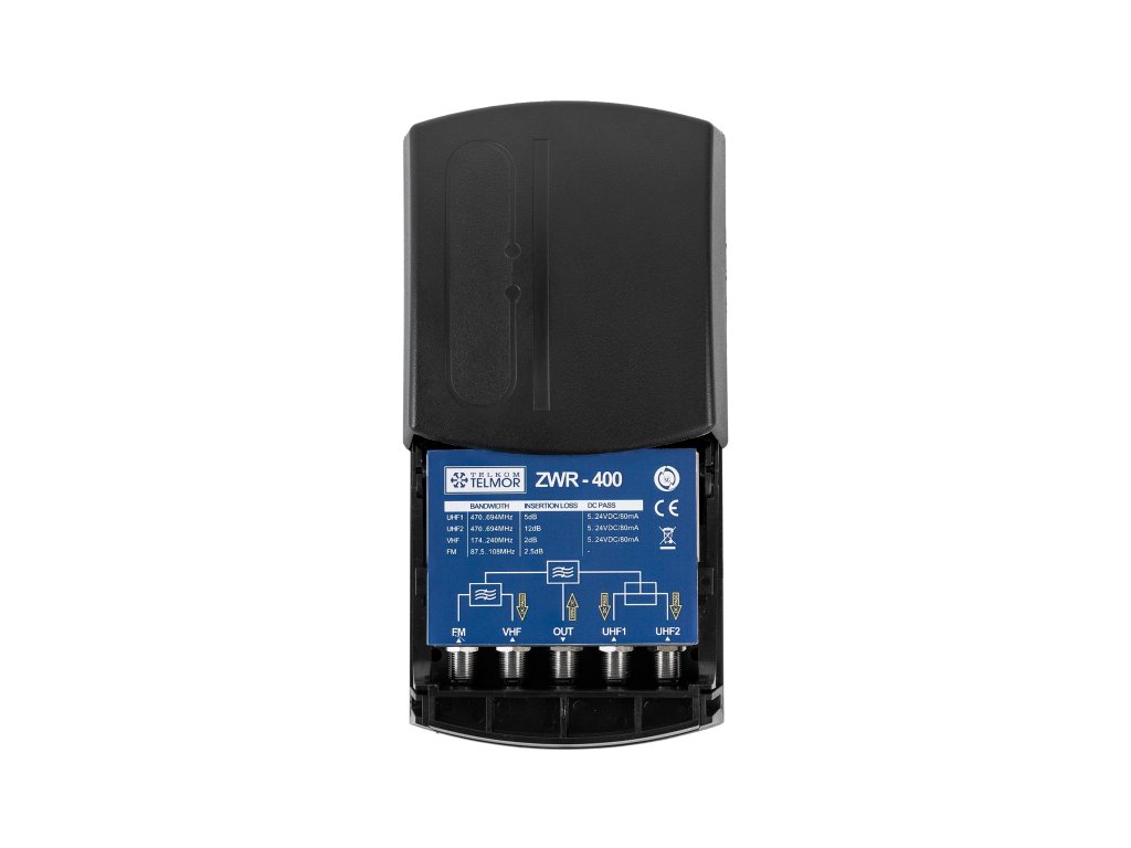 ZWR-400 je pasovna razvodnica z štirimi vhodi: FM, VHF, UHF1 in UHF2 ter enim izhodom. Naprava omogoča združevanje signalov iz televizijskih anten VHF in UHF ter radijske antene. Frekvenčno območje prenosa FM: 87,5-108 MHz, VHF: 174-240 MHz, UHF1 in 2: 470-694 MHz.