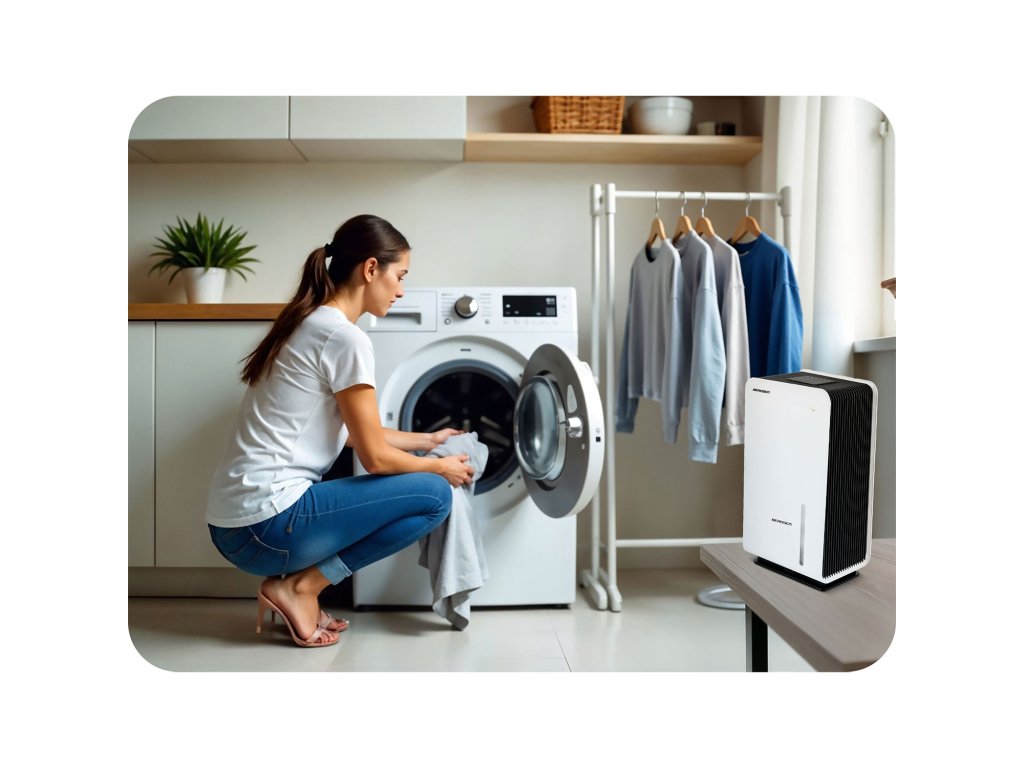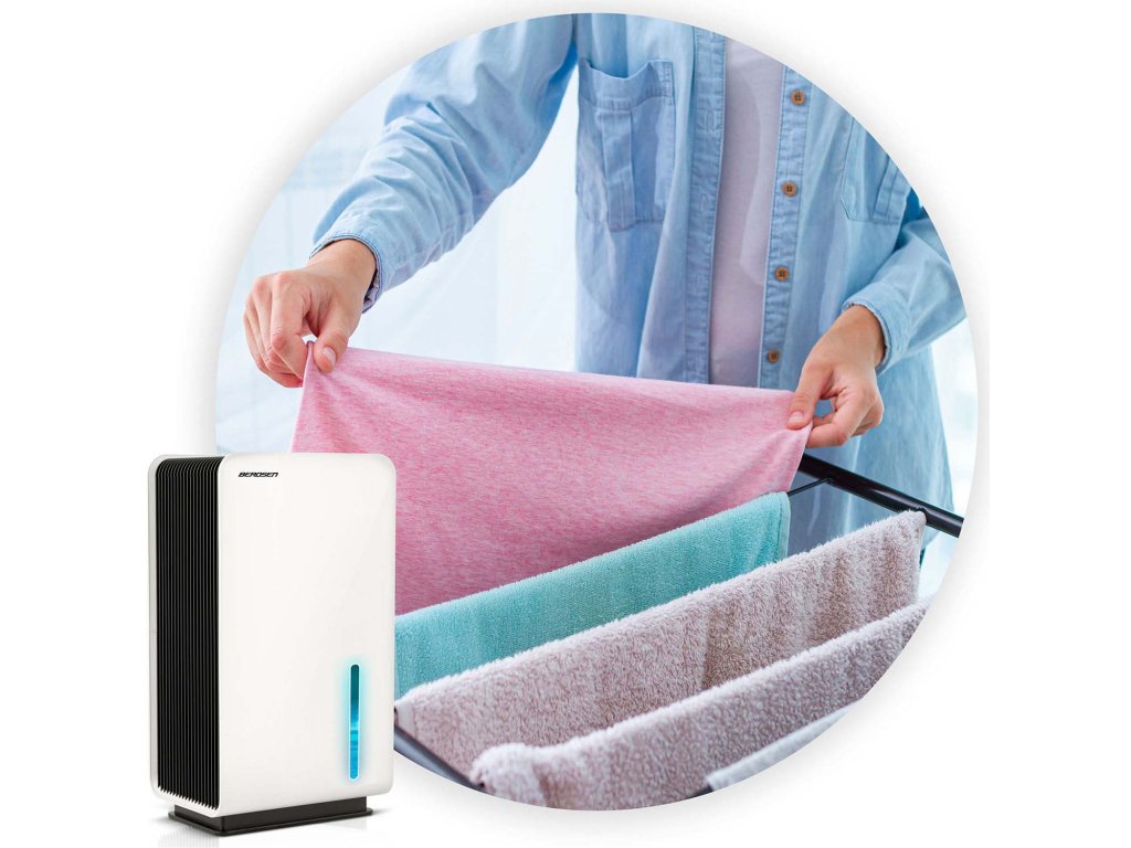 - Skrčuje čas sušenja oblačil – razvlaževalec intenzivno suši zrak, pospešuje naravni proces izhlapevanja vlage iz perila.