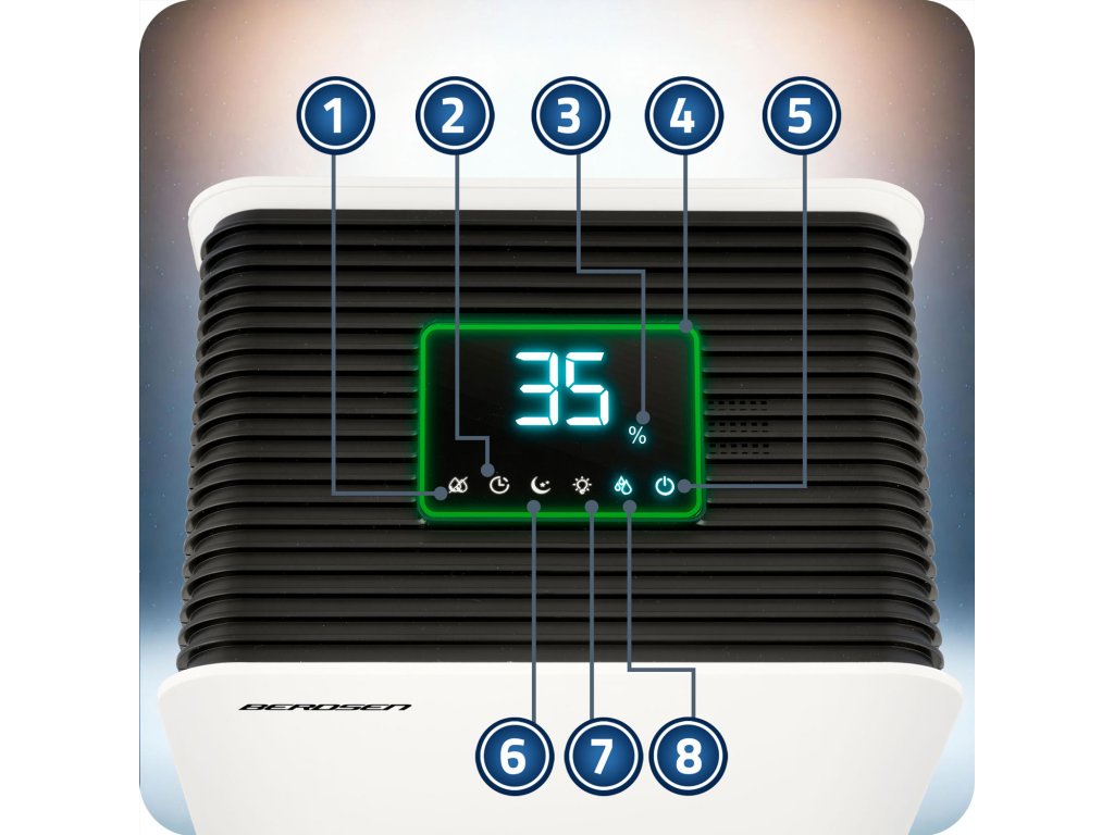 Moderen, na dotik občutljiv upravljalni panel z mehkim sistemom, nameščen na zgornji strani razvlaževalca, zagotavlja najvišje udobje uporabe.