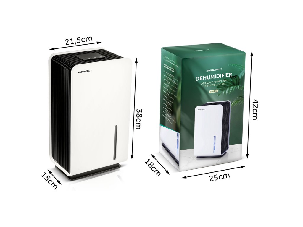 Razvlaževalec zraka BD-531 je kompaktna, profesionalna in funkcionalna naprava, ki deluje z največjo zmogljivostjo 800 ml/dan. Lovilec vlage BD-531 deluje po principu kondenzacije, ki učinkovito izloča vlago iz zraka. Tako zmanjša pojav gliv, plesni in neprijetnih vonjav v prostoru ter hkrati povečuje vaše udobje.