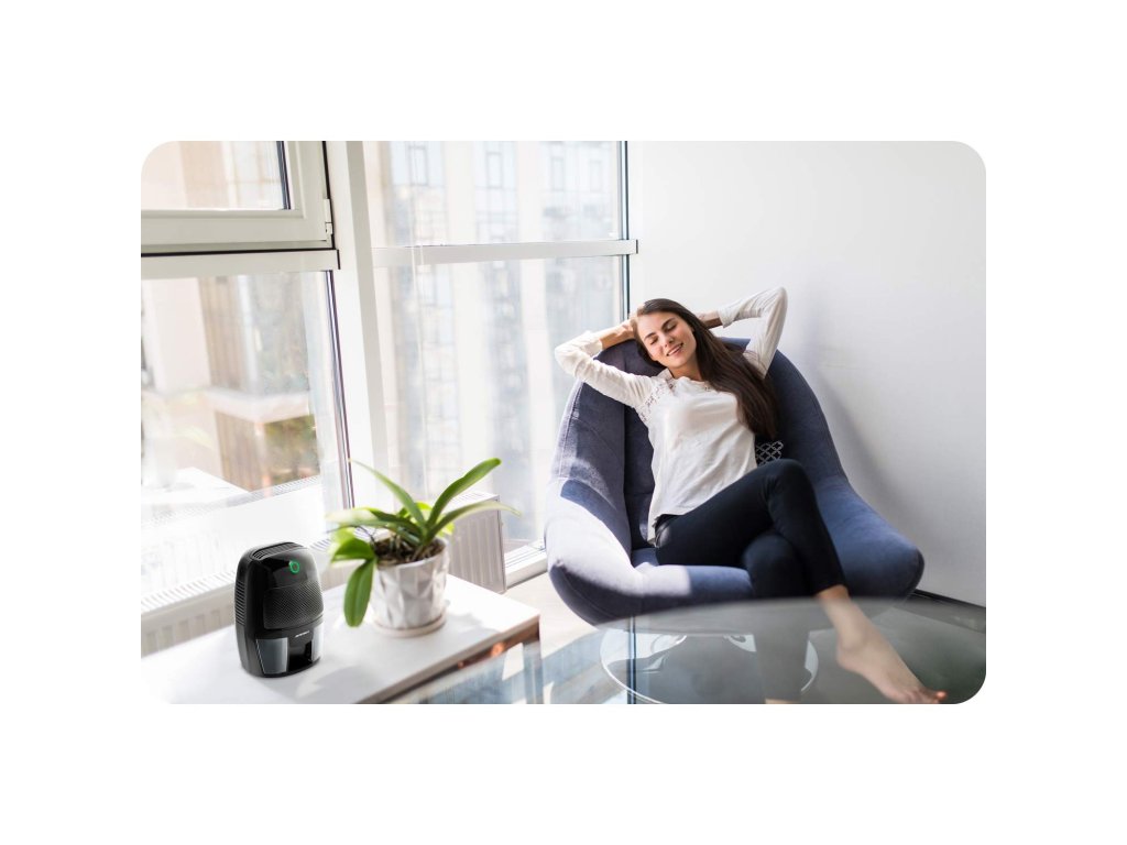 Razvlaževalnik je preprost za uporabo in zaradi majhnih mer ga je mogoče postaviti tudi v garderobne omare, omare in kuhinjske omarice. Razvlaževalnik ima vgrajen detektor nivoja vode. Ko je rezervoar za vodo poln, se naprava samodejno izklopi in indikator se spremeni iz zelene na rdečo.