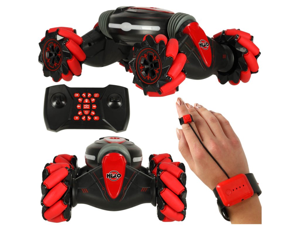 Nenápadné "hodinky" na diaľkové ovládanie sú mimoriadne zábavné! Vysoko citlivé diaľkové ovládanie, ktoré sa nosí na ruke, umožňuje ovládať vozidlo gestami. Umožňuje nielen riadiť vozidlo, ale aj meniť hudbu alebo tvar vozidla. Ovládanie gestami je zábavné a vzbudzuje rešpekt!