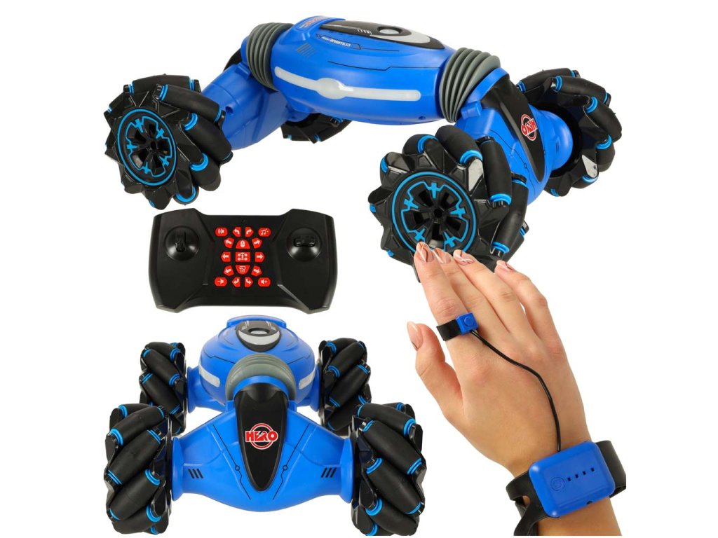 Nenápadné "hodinky" na diaľkové ovládanie sú mimoriadne zábavné! Vysoko citlivé diaľkové ovládanie, ktoré sa nosí na ruke, umožňuje ovládať vozidlo gestami. Umožňuje nielen riadiť vozidlo, ale aj meniť hudbu alebo tvar vozidla. Ovládanie gestami je zábavné a vzbudzuje rešpekt!
