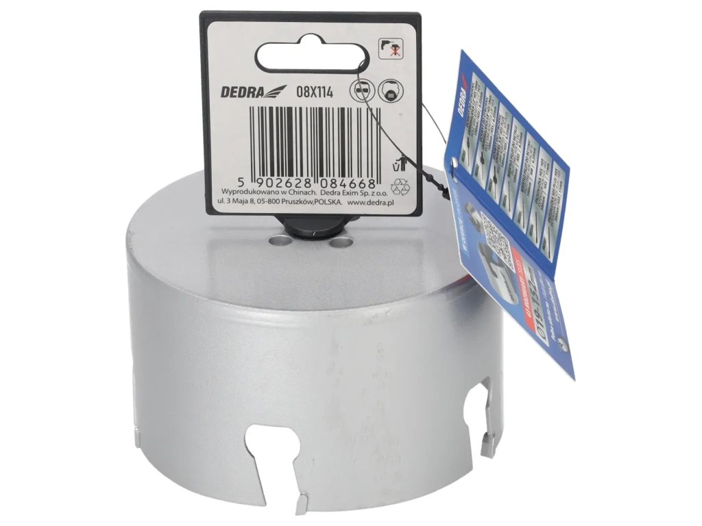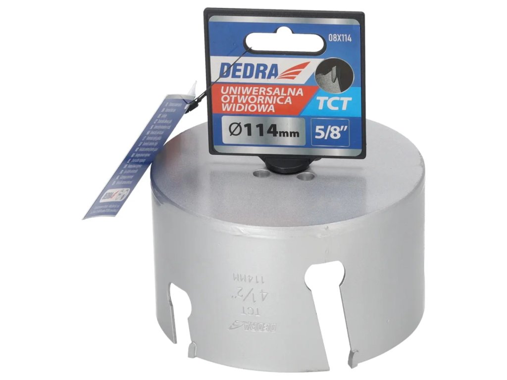 Univerzalna žaga za luknje je nepogrešljivo orodje v delavnici za domače mojstre. Posebna konstrukcija rezalnega roba povečuje trdnost žage in izboljšuje vodenje luknje. S pomočjo vpenjalnih glav HEX 10 mm 1 /2" 08X001 (priporočeno za luknje: 08X019-08X030) in 5/8" vpenjalnih glav 08X002 (priporočeno za luknje: 08X032-08X152) je mogoče uporabljati žage za luknje na vrtalnikih ali vrtalnih strojih. S pomočjo vpenjalne glave SDS+ 08X003 (priporočeno za luknje: 08X032-08X152) je mogoče uporabljati žago za luknje DEDRA 08 X razširjeno z udarnim vrtalnikom v načinu brez udarca. Za izboljšanje rezalnih učinkov in povečanje trdnosti imajo luknje več vilic, ki učinkovito obdelujejo material. Univerzalni pilotni svedri DEDRA 08 X se lahko z uporabo ustreznega pilotnega svedra uporabljajo za delo v lesu, kovinah, pohištvenih ploščah, PVC, mineralnih materialih, kot so keramične ploščice, porozni beton in silikati. Za povečanje trdnosti lukenj je jedro izdelano iz visokokakovostnega jekla HCS št. 45 z debelino 1,5 mm, zobje pa so izdelani iz volframovega karbida s 6 % kobalta (volframovo jeklo YG 6X). S tem se izboljšuje kakovost in vzdržljivost reza ter povečuje učinkovitost vrtanja.