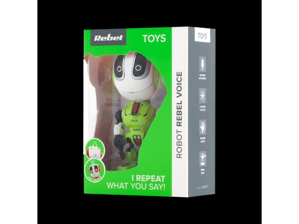 Podarite svojemu otroku novega prijatelja! Rebel Voice je igrača robot, ki zagotavlja kreativno zabavo! Ta interaktivna igrača zna poslušati, nato pa ponovi, kar sliši, smešno popači glas. Zaradi tega odlično razvija domišljijo, vaš otrok ga bo vzljubil od prve besede.