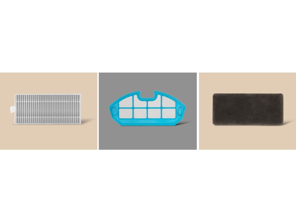 V kompletu: 3x filter HEPA 11, rezervoar 2v1, 2x krpa za mokro čiščenje, daljinec, 2 para stranskih krtač, čistilni čopič, polnilna postaja, omrežni adapter