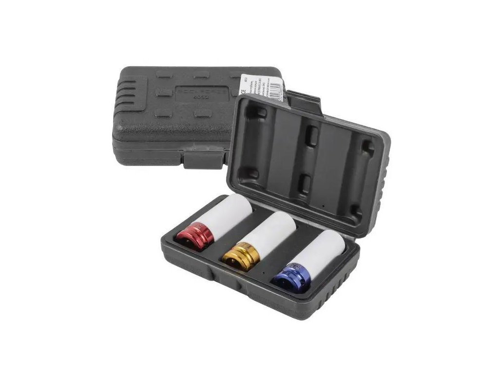 Profesionalni komplet udarnih nastavkov za aluminijaste platišča – tri najbolj priljubljene velikosti (17, 19, 21 mm) v različici 6-kotne, globoke in tankostenske. Nastavki imajo pogonski kvadrat 1/2", so izdelani iz visoko odporno legiranega jekla SCM440 (Cr-Mo) in zasnovani za delo z udarnimi ključi – varno prenašajo velike dinamične obremenitve, ostajajo odporni proti razpokam in deformacijam. Vsak nastavček ima zaščitni pokrov, ki učinkovito ščiti aluminijasta platišča pred praskami med montažo in demontažo koles.