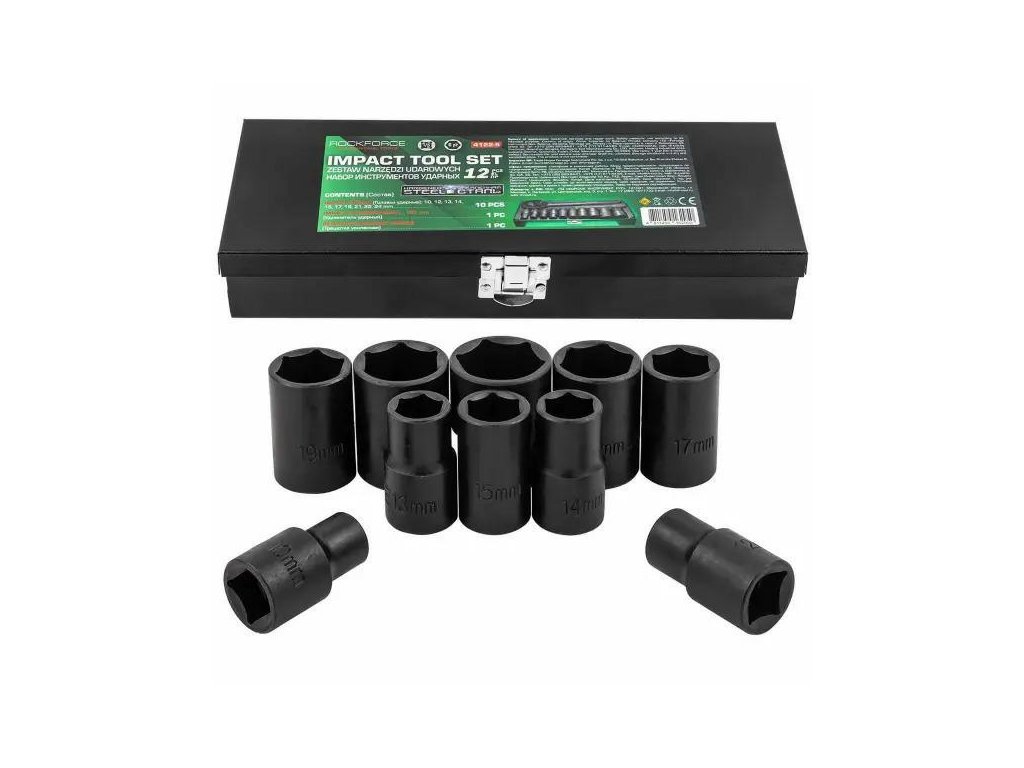 Set udarnih orodij Rockforce 12-delni 1/2'' je namenjen tistim, ki pričakujejo zanesljivost, vzdržljivost in udobje pri delu v kakršnikoli delavnici. Del kompleta je 10 udarnih šestkotnih nastavkov, visoko odporen rastnik, podaljšek 150 mm in praktična transportna torba, s katero imate celoten set vedno pri roki in v celoti zaščiten. To orodje je primerno tako za profesionalne avtoservise kot tudi za domače garaže.
