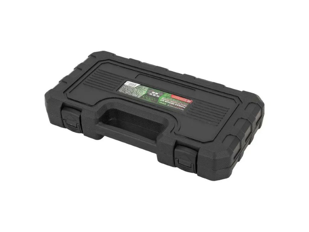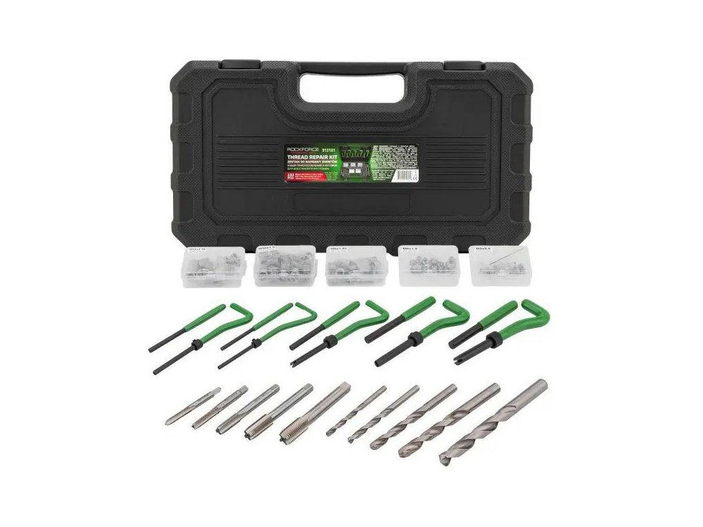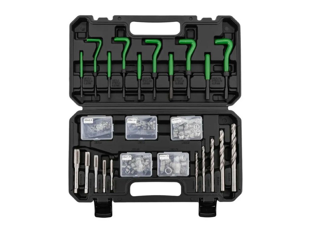 Profesionalni komplet za obnovo in popravilo poškodovanih navojev M5–M12 – do 131 elementov v trdni delovni transportski torbi. Komplet vsebuje vse potrebno za učinkovito obnovo poškodovanih, obrabljenih ali korodiranih notranjih navojev: navoji, spiralne vložke, vrtalnike, montažne orodje in izvlečke. Nepogrešljiv pripomoček v vsakem avtomobilskem delavnici, mehanični servis, ključavničarski delavnici, kot tudi v industrijskih in popravnih aplikacijah.