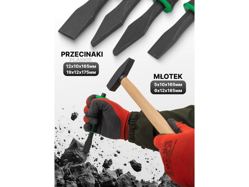 Vsak element je izdelan iz visoko kakovostnega kaljenega jekla za orodja, odpornega na velika udarna obremenitev, deformacije in obrabo. Zaradi tega orodje ohranja ostrino in učinkovitost tudi pri intenzivni uporabi. Natančni delovni robovi zagotavljajo čiste reze, natančno dletanje in precizne udarce na površinah.