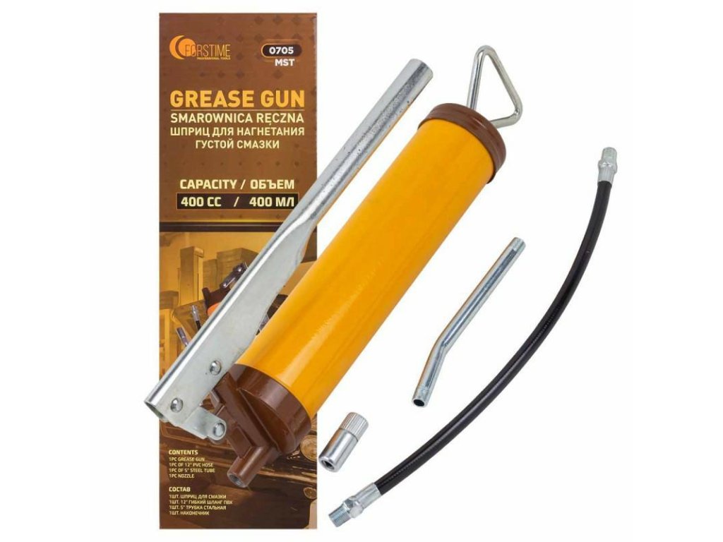 Ročni brizgalnik s pogonom na ročko in bat, namenjen za vbrizgavanje gostega maščobnega sredstva, vključno z trdo konico - namenjen za vbrizgavanje gostega maziva na različne površine in mehanizme. Trda konica omogoča dosego težko dostopnih mest.
