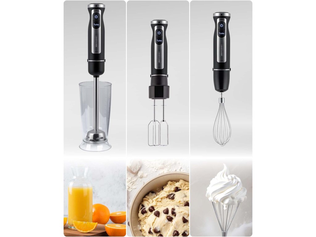 Super močan mešalnik 1500 W, s celotnim kompletom dodatkov Berdsen 375400 Stavite na moč, slog in zanesljivost — izberite mešalnik, ustvarjen za kulinarične mojstre! Prednosti izdelka: ? Impresivna moč s funkcijo TURBO — meša najtrše izdelke. ? Zanesljivo in privlačno rezilo iz titana — natančnost in trpežnost ? Bogat komplet večfunkcijskih dodatkov — popolna podpora v kuhinji. Kar 6 različnih funkcij! ? Izjemna kakovost in stilsko oblikovanje — eleganten videz premium jeklenih detajlov in matiranega zaključka. ????? Močno titanovo rezilo GOLD Titanovo rezilo GOLD se odlikuje po izredni trdoti in odpornosti proti koroziji, kar omogoča bistveno daljšo življenjsko dobo mešalnika. Zahvaljujoč visoki trpežnosti titana, se rezilo brez težav spopade z najtršimi sestavinami, kar omogoča hitro in učinkovito mešanje. Gladka površina rezila olajša čiščenje in ohranjanje higiene, kar zagotavlja brezproblematično uporabo vsak dan. Osnovni dodatek za mešanje Služi za mešanje in sekljanje sestavin v gladko maso. Idealen za pripravo kremnih juh, omak, smoothijev ali zelenjavnih pirejev. Nastavek za stepanje/pire Namenjen drobljenju in stepanju mehkih sestavin, kot so krompir, sladki krompir ali druga zelenjava. Pomaga doseči enotno konsistenco pireja. Sekalnik Namenjen sekljanju in mletju trdih sestavin, kot so oreščki, čebula, meso ali zelišča. Omogoča hitro pripravo nadevov, past in drobno nasekljanih sestavin. Nastavek za mešanje s posodo Služi za mešanje in sekljanje sestavin v gladko maso. Idealen za pripravo koktajlov, smoothijev, omak in kremnih juh. Nastavek za miksanje Namenjen je za gnetenje testa, mešanje sestavin za pecivo ter pripravo mas z enotno teksturo. Nastavek za stepanje/žica Služi za stepanje smetane, beljakov, krem ter lahkih peciv, kot so biskvitne. Izjemno močan motor — kar 1500 W! Močan motor z močjo 1500 W in funkcijo turbo omogoča bliskovito in učinkovito mešanje, tudi z najtršimi sestavinami. Funkcija turbo omogoča takojšnje povečanje moči, kar olajša sekljanje ali mešanje velikih porcij sestavin v krajšem času. 25 stopenj hitrosti in gumb Turbo. Mešalnik ponuja kar 25 stopenj hitrosti z gladkim uravnavanjem ter dodatni način TURBO, kar zagotavlja maksimalen nadzor in hitrost mešanja. Tehnične podrobnosti Nazivna moč: 1500 W Maksimalna hitrost vrtenja: 17250 obratov/minuto Napajanje: 220-240 V Material: jeklo in plastika (BPAfree) Zaščita pred nepravilno sestavo Zaščita pred pregrevanjem Titanovo rezilo Prostornina posode s pokrovom: 800 ml 25 stopenj hitrosti Dolžina kabla: 1,3 m Neto teža: 1,55 kg Certifikati: CE, REACH, ROHSAdditional parameters
