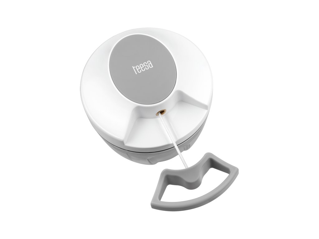Uporabljajte sekljalnik Teesa kjerkoli želite! Naprava je zasnovana tako, da vas ne omejuje doseg napajalnega kabla. Skrivnost hitrega in učinkovitega delovanja je v mehanizmu z vrvico. Dovolj je, da nekajkrat povlečete samodejno zložljivo vrvico, ki požene rezila v gibanje, in vse sestavine bodo primerno nasekljane.