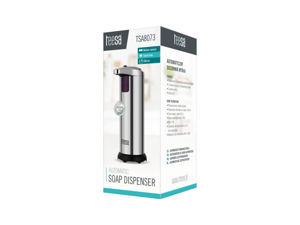 Podajalnik je opremljen s senzorjem gibanja – roke je treba samo približati podajalniku, da se tekočina aplicira. Poleg tega ima naprava 3-stopenjsko regulacijo, zato lahko sami nastavite količino dozirnega mila. Podajalnik mila Teesa ima 250 ml kapacitete, zato vam ni treba skrbeti za pogosto dopolnjevanje. Izpostaviti je vredno tudi material, iz katerega je narejen. Nerjaveče jeklo je bistveno bolj odporno na vlago in zmanjšuje tveganje za nastanek korozije.