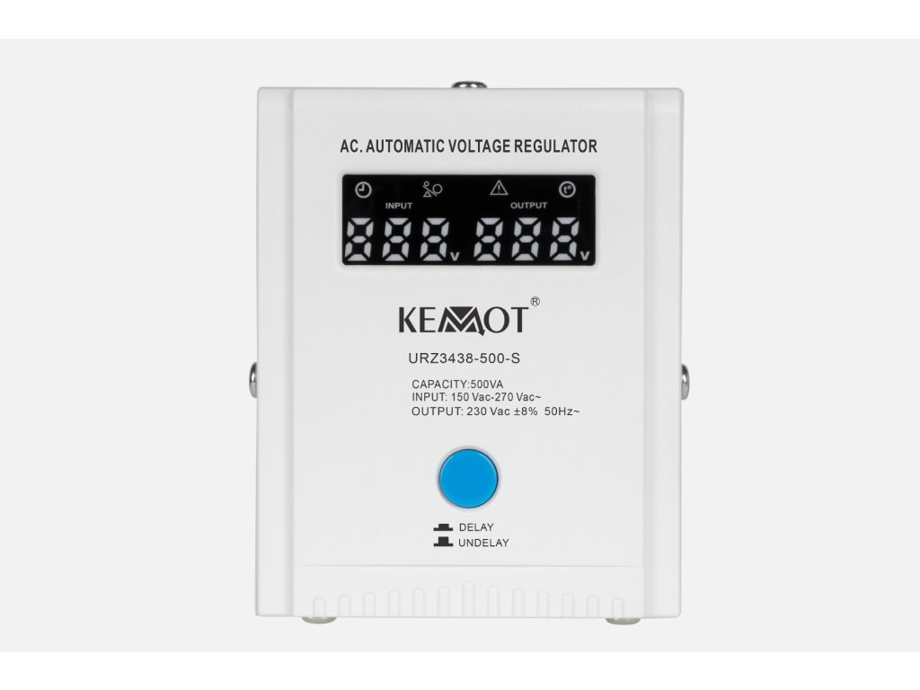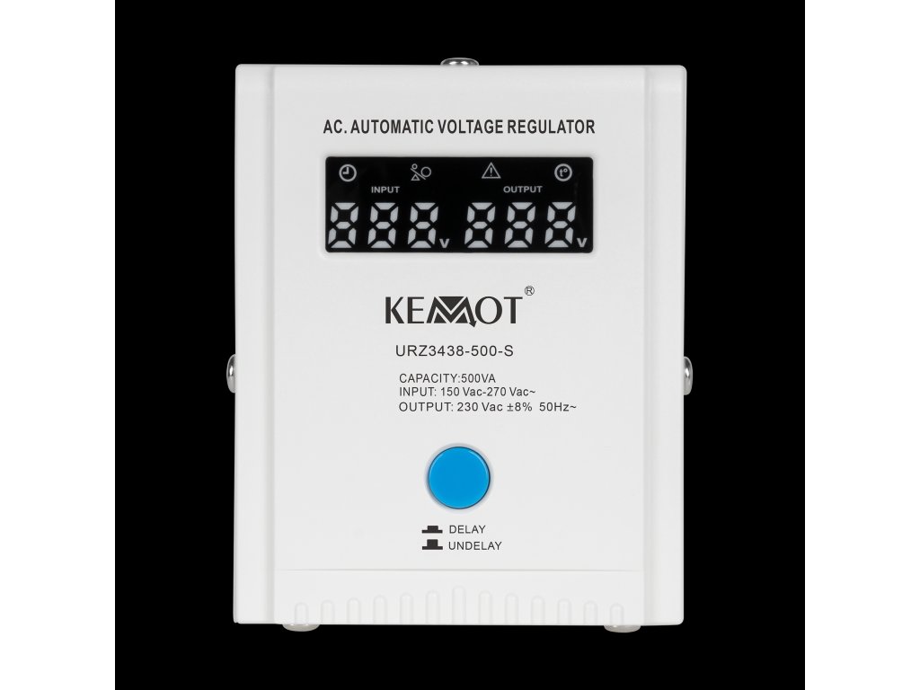 Če potrebujete stabilizator napetosti za naprave z velikim zagonskim tokom, izberite model opremljen s funkcijo zakasnitve vklopa DELAY. KEMOT SER-500-S je opremljen z gumbom za zakasnitev vklopa DELAY v razponu od 6 do 180 sekund, kar zmanjšuje tveganje njegove poškodbe, ko imajo priključene naprave velik zagonski tok. Poleg tega ima stabilizator SER-500-S zaščito pred preveč visoko in nizko napetostjo, preobremenitvijo, pregrevanjem in kratkim stikom.