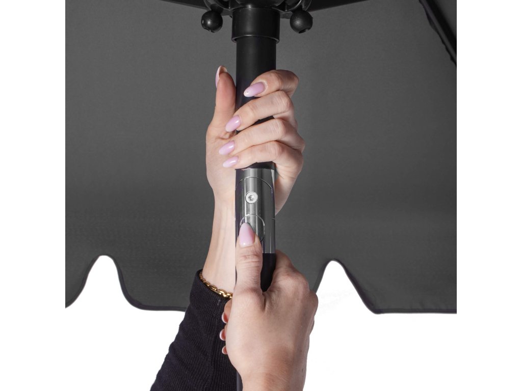 V primeru močnega sunka vetra se priporoča zlaganje dežnika zaradi velike velikosti strehe in s tem povezane varnosti.