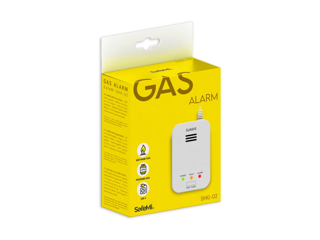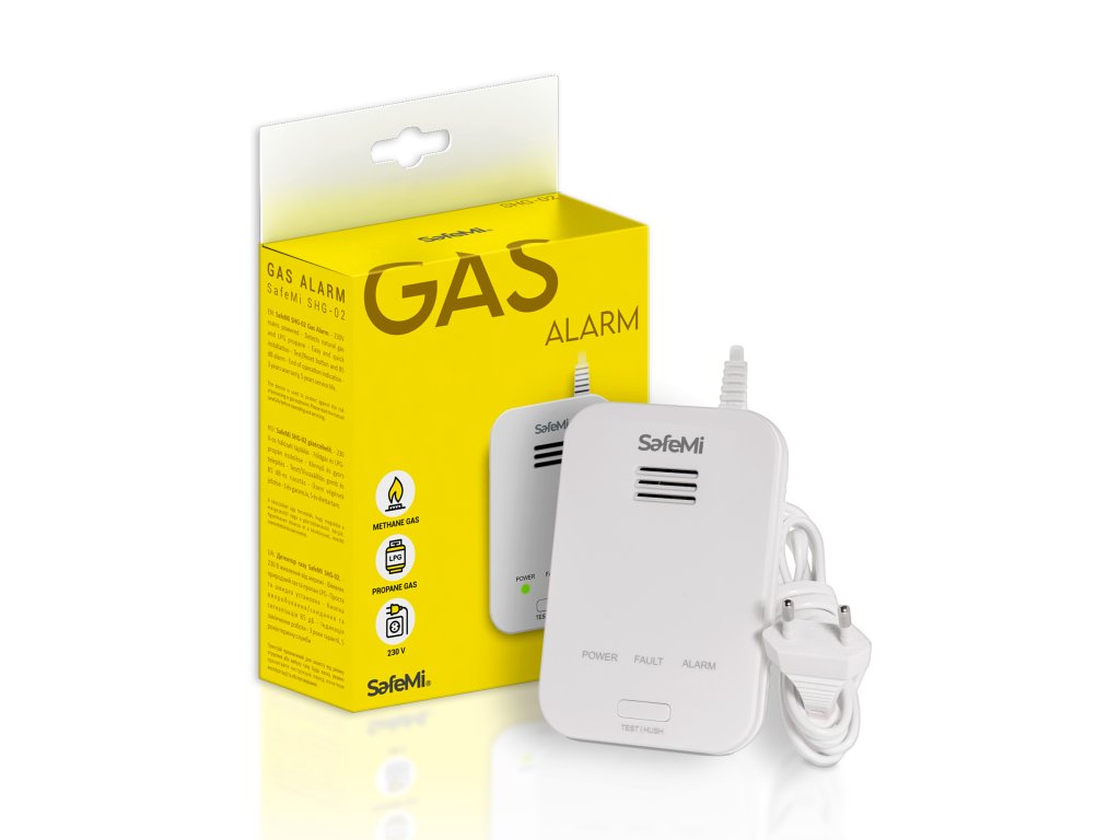 Senzor SafeMi SHG-02 je namenjen za spremljanje prostorov glede prisotnosti propan-butanskega (LPG) plina. Senzor prav tako zaznava metan. Naprava se lahko montira ne le v gospodinjstvih, temveč tudi v storitvenih in uporabnih prostorih. Senzor SafeMi SHG-02 neprekinjeno meri koncentracijo plina v okoliški atmosferi. V primeru zaznave uhajajočega plina naprava aktivira optični in akustični opozorilni signal. Alarm se izklopi, ko koncentracija plina pade pod prag aktivacije senzorja. Naprava ima sistem samodiagnostike, ki spremlja senzor in notranje elektronske tokokroge. V primeru nepravilnega delovanja se prižge rumena LED dioda (Napaka), ki označuje zaznano napako. Senzor je napajan iz omrežja 230V/50Hz. Lahko je montiran v prostorih, kjer temperatura ne pade pod -10°C in se ne dvigne nad +40°C (občasno od -20°C do +60°C), relativna vlažnost pa ne presega 95%. Izdelek ima 3-letno garancijo in 5-letno življenjsko dobo. Naprava samodejno informira o koncu življenjske dobe in potrebi po zamenjavi.