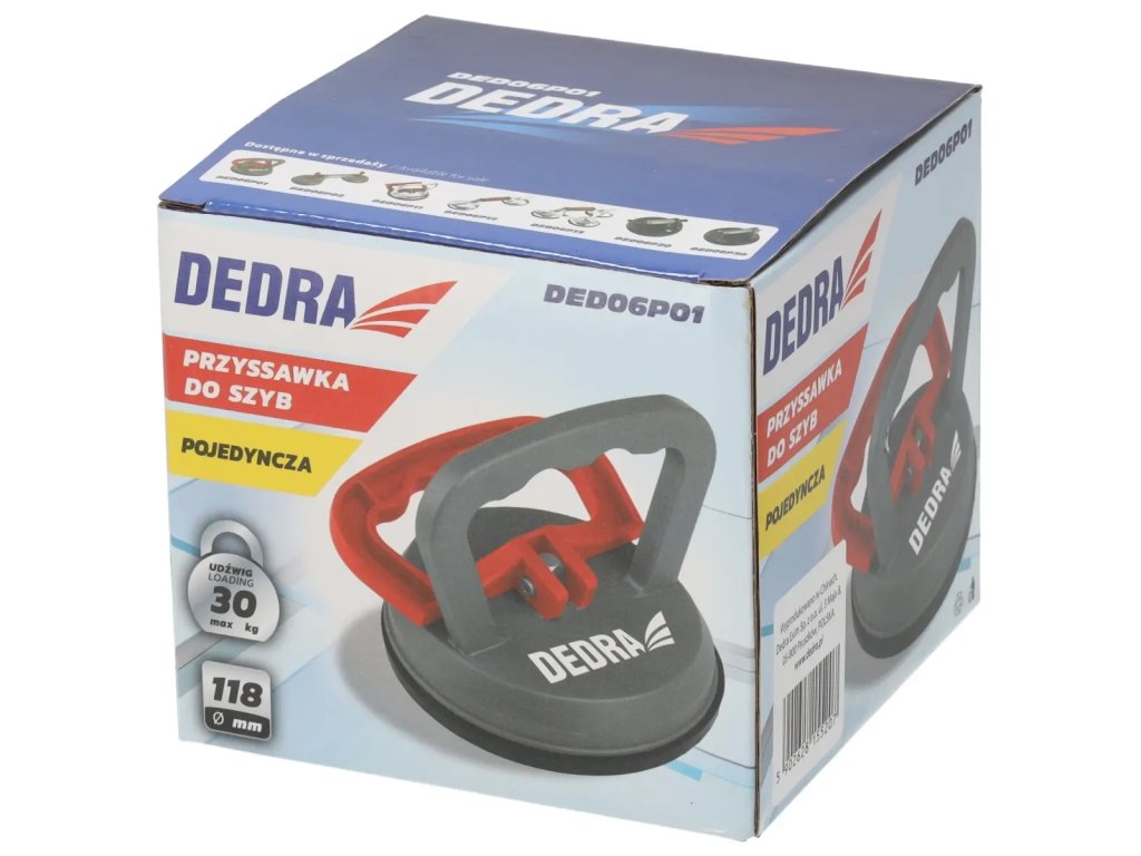 Največja nosilnost prisesalke za zasteklitev DED06P01 je 30 kg, kar je najbolj primerno za prevoz plošč, srednje velikih stekel.