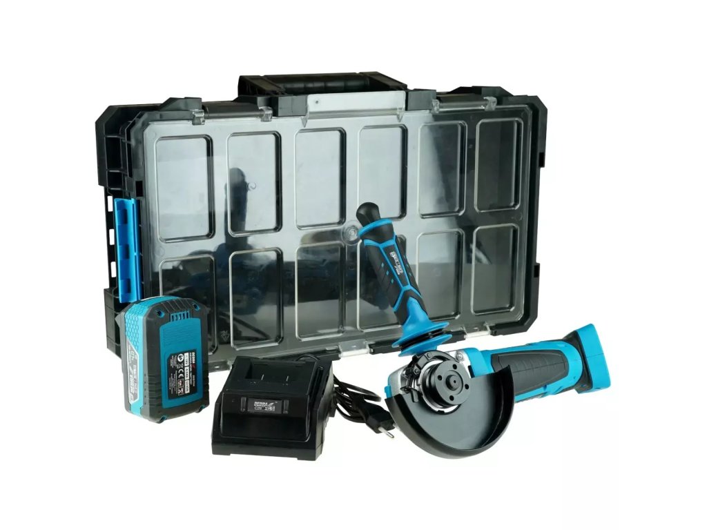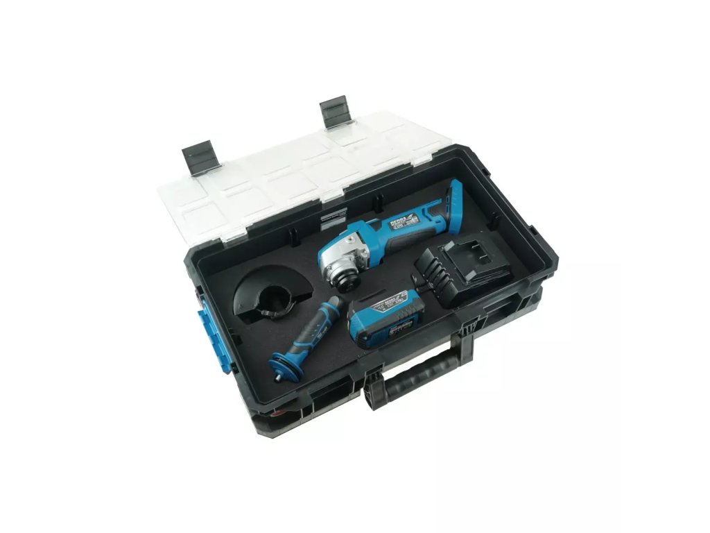 Akumulatorski kotni brusilnik DEDRA SAS+ALL DED7050 je orodje, namenjeno za rezanje in brušenje. Motor brusilnika doseže hitrost 9.500 vrtljajev na minuto in je združljiv z diski velikosti 125 mm in 115 mm. Brusilnik je opremljen s hitro sprostitvijo stikala, ki preprečuje izklop stroja, ko je pritisk na obdelovanec prevelik. K udobnosti brusilnika prispeva tudi sistem hitre sprostitve diska, tripozicijski bočni ročaj in gumijasti ročaj. Ključ za menjavo rezila je nameščen v bočnem ročaju, tako da je uporabniku vedno na dosegu. Ohišje je izdelano iz najlona, ojačanega s steklenimi vlakni, kar ga naredi bolj odpornega na mehanske poškodbe in UV svetlobo. Ergonomijo in udobje izboljšuje nizka teža naprave in integriran ročaj. Akumulatorska baterija za akumulatorski kotni brusilnik je DED7034 s kapaciteto 4,0 Ah.