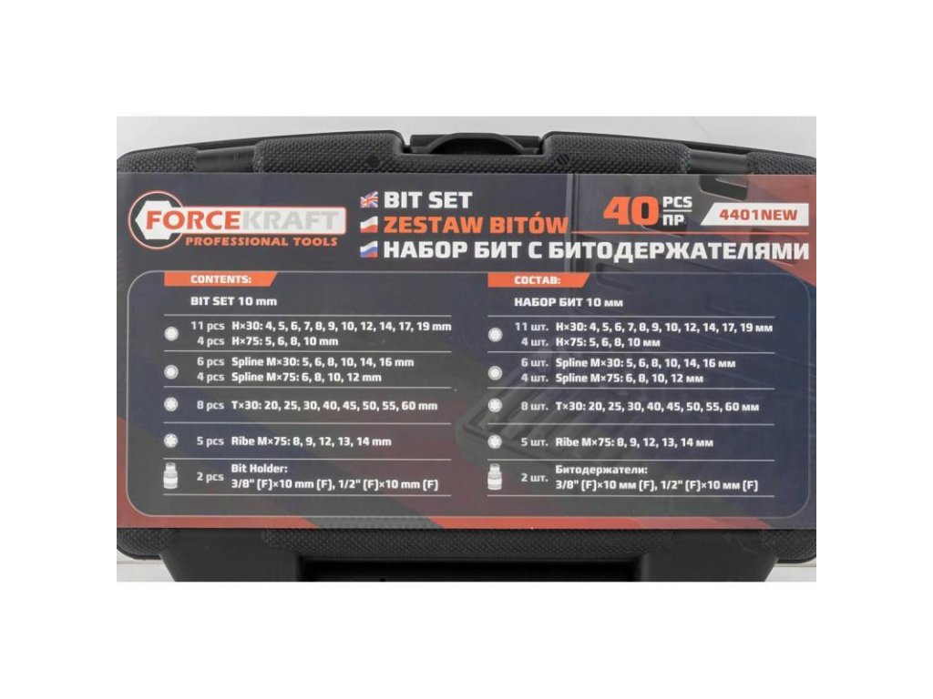 Profesionalni set bitov, namenjen odvijanju posebnih tipov vijakov: hex, torx, spline. Raznolikost bitov zagotavlja možnost izvajanja številnih nalog v specializiranih mehaničnih in avtomobilskih servisih. Biti so izdelani iz krom-vanadijeve jekla razreda 50BV30, v katerega so bili uvedeni posebni dodatki kovin z namenom zagotavljanja najboljših fizikalnih in mehanskih lastnosti, kar zagotavlja visoko trajnost in zanesljivost. Set je pakiran v praktičnem plastičnem kovčku za prenašanje in shranjevanje.