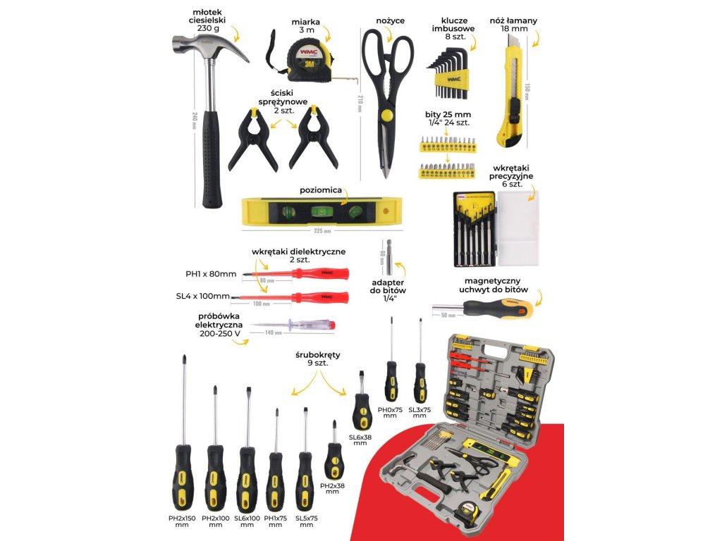 - 9 kosov izvijačev: PH1x75 , PH2 x100mm, PH2x150 mm, PH2x38 mm, SL6x100 mm, SL5x75 mm, SL3x75 mm, SL0x75 mm, SL6x38mm.