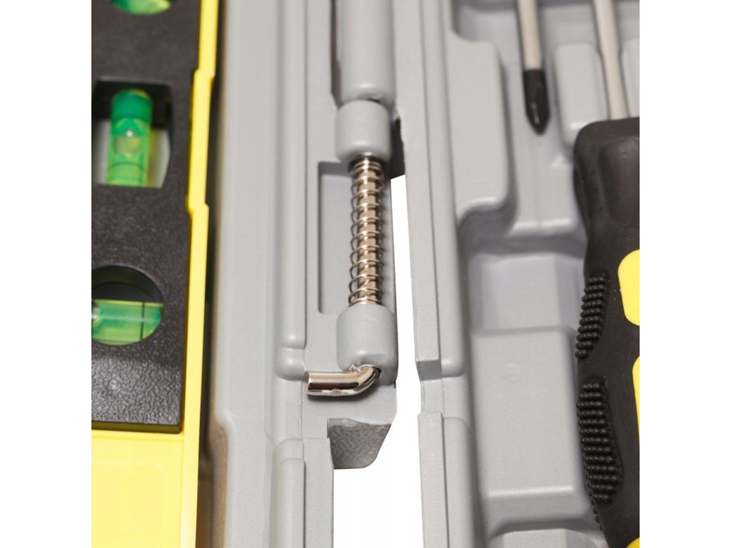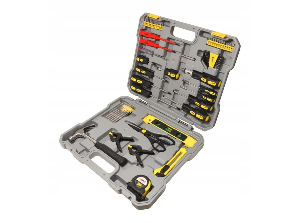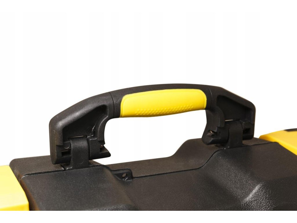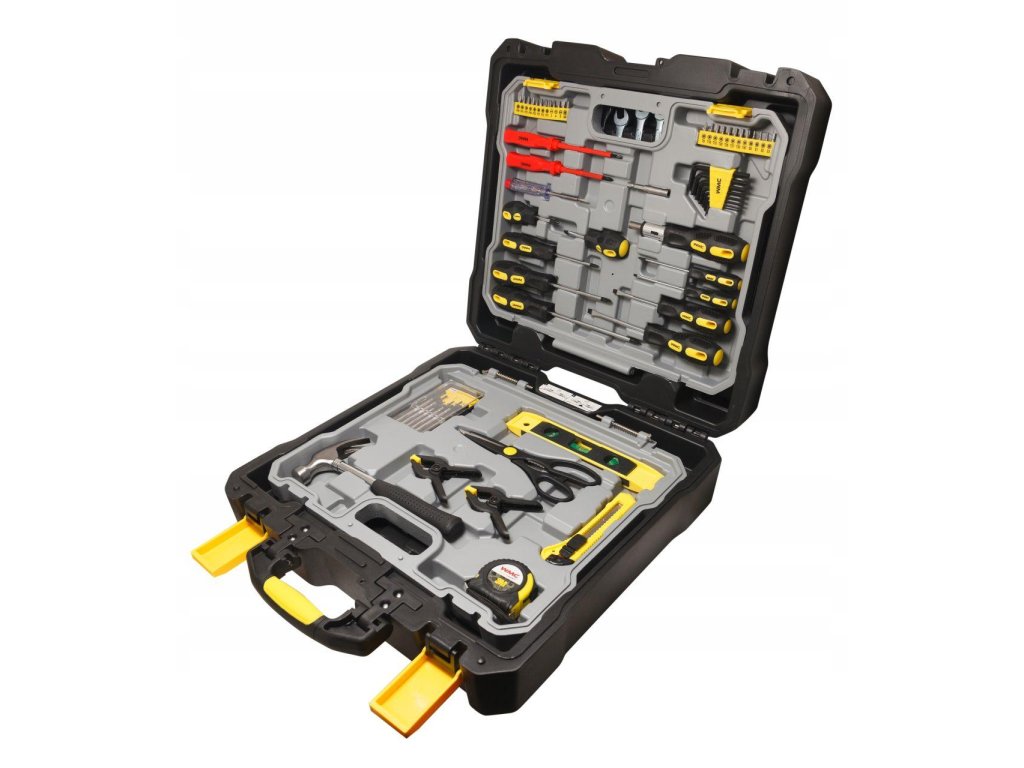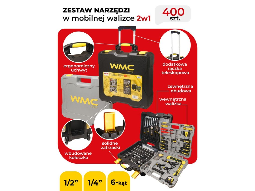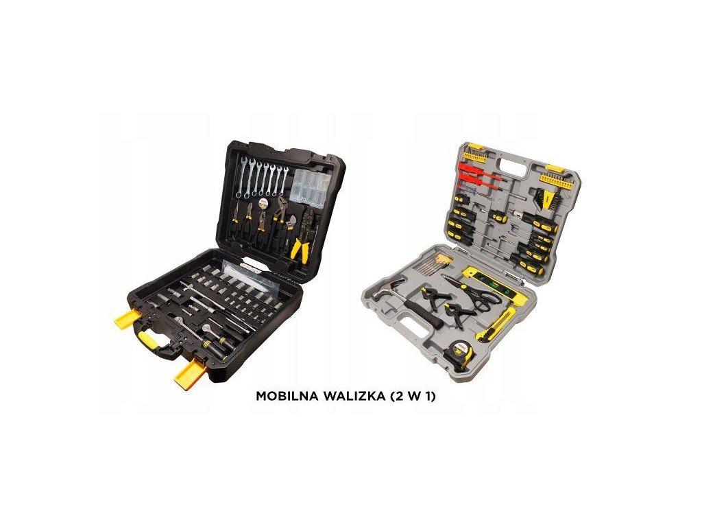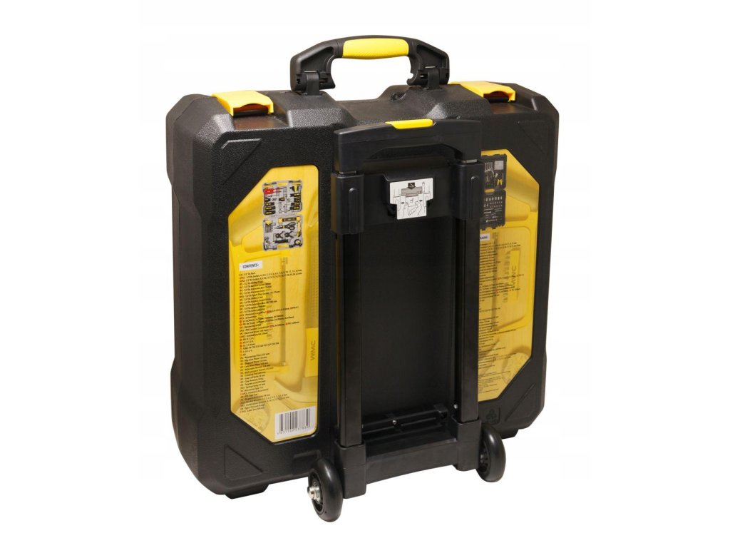 Komplet orodja v kovčku (Mobilni kovček 2 v 1). Vgrajena kolesa olajšajo premikanje kovčka in telescopska ročica. Popolnoma izdelan kovček za orodje. Celoten komplet je izdelan z osredotočenostjo na trdnost. Kovček s kolesi in telescopsko ročico za prenos kompleta (kot potovalni kovček).