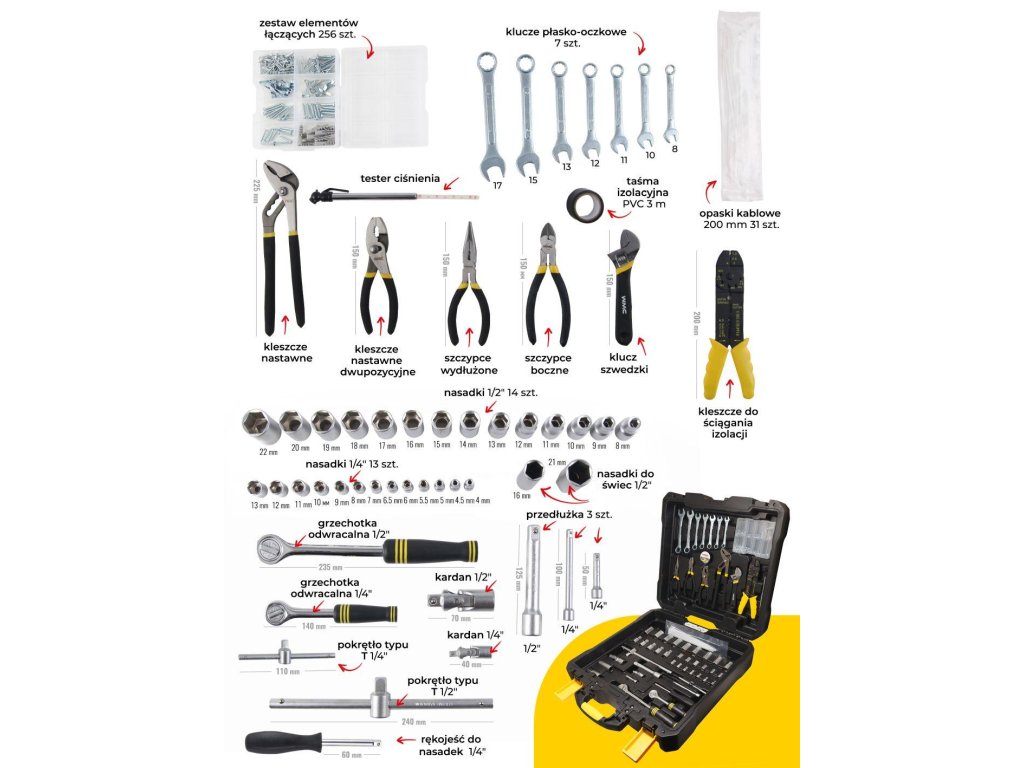 | Komplet orodja v kovčku (Mobilni kovček 2 v 1). Vgrajena kolesa olajšajo premikanje kovčka in telescopska ročica. Popolnoma izdelan kovček za orodje. Celoten komplet je izdelan z osredotočenostjo na trdnost. Kovček s kolesi in telescopsko ročico za prenos kompleta (kot potovalni kovček). |