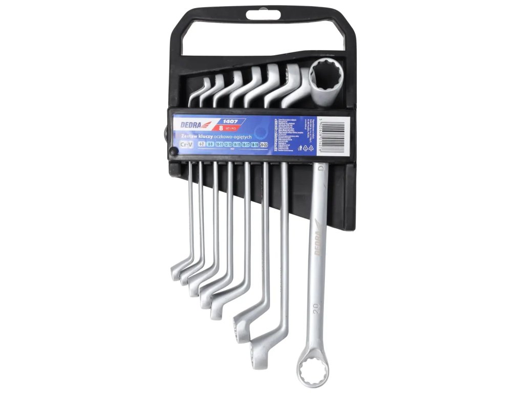 - Ukrivljeni obročni ključi: 6 x7, 8 x9, 10 x11, 12x13, 14 x15, 16x17, 18 x19, 20x22 mm