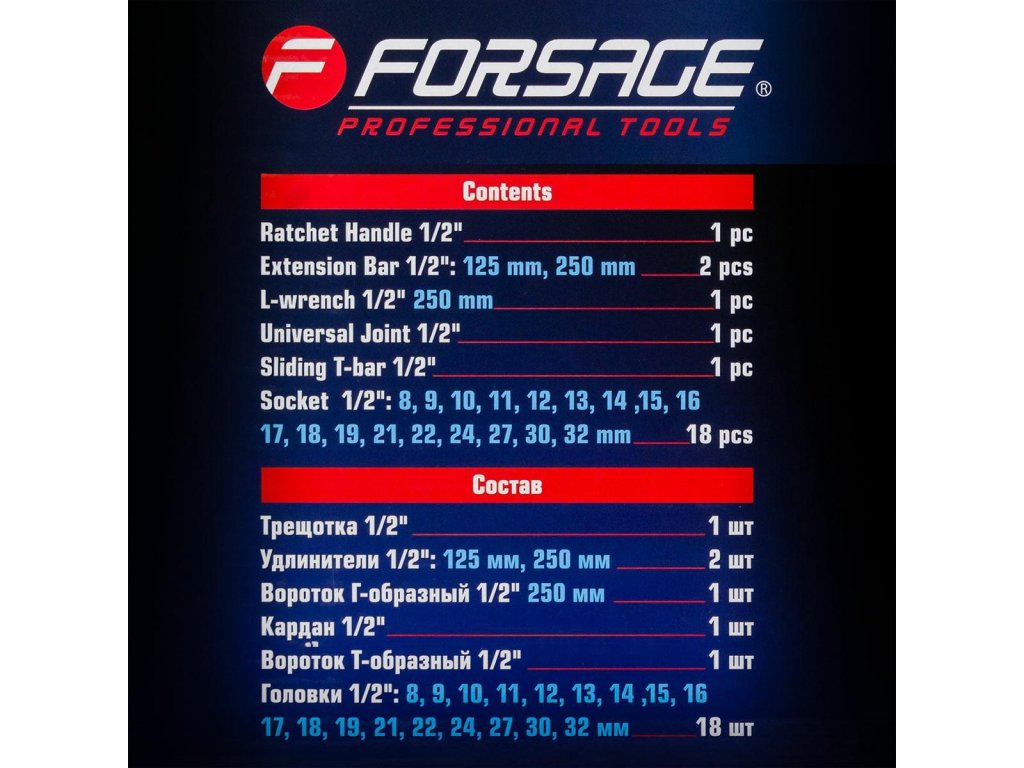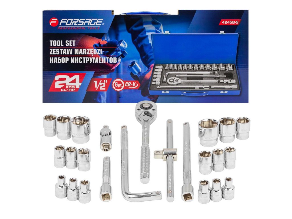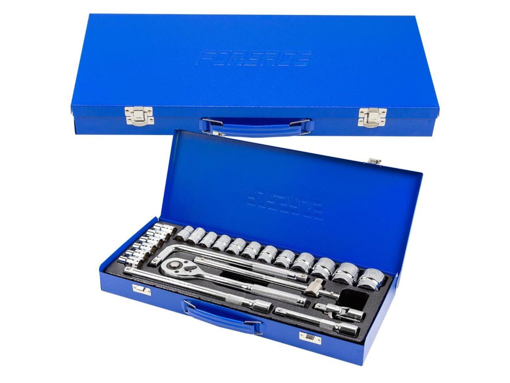 - Set vsebuje 24 elementov v kovinskem pakiranju. Vključuje ključe, podaljške, nastavke, ratchet in kardano.