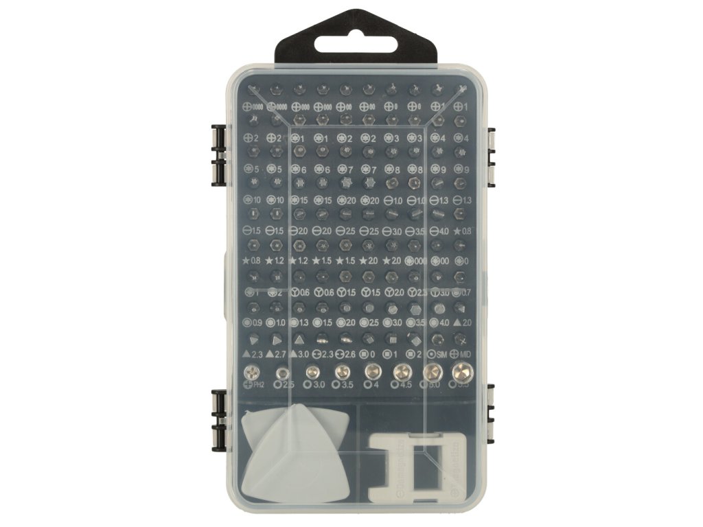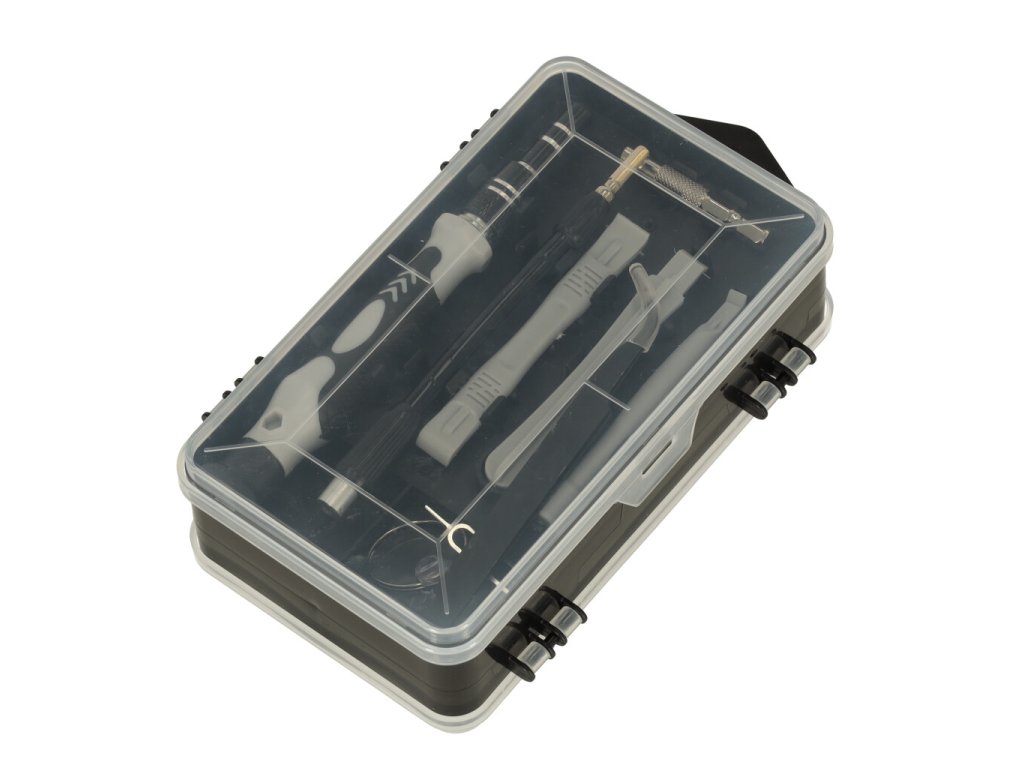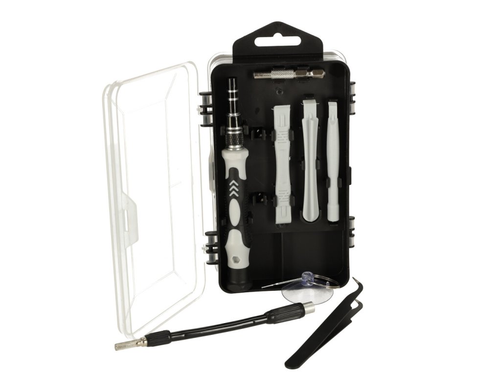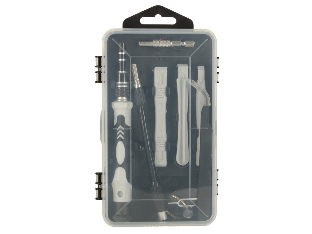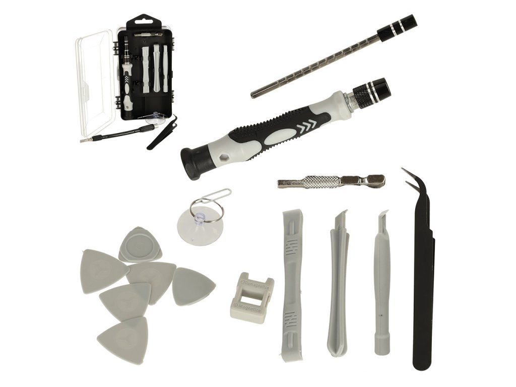 Poleg izvijača in popolnega kompleta nastavkov komplet vsebuje še druge izredno uporabne pripomočke, kot so podaljšek za izvijač, pinceta, prisesek za odstranjevanje stekla, odpirači ohišij, ključ za izmet SIM kartice in magnetizer.