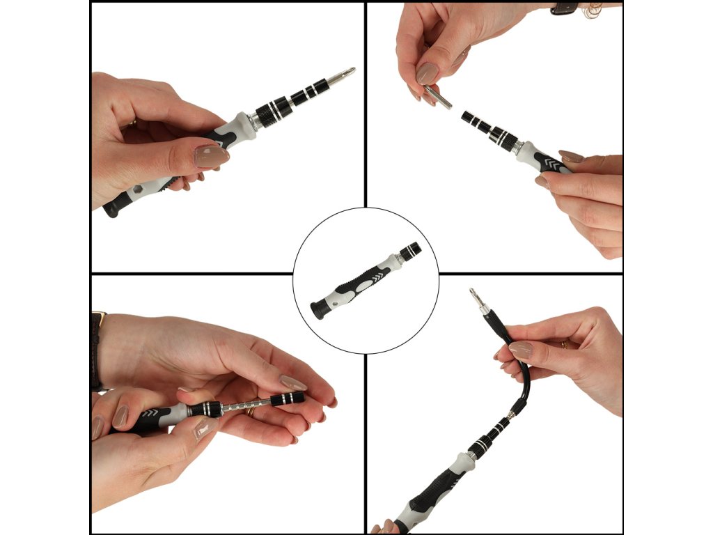 Natančni izvijač z zamenljivimi nastavki vas bo pripravil na vsako situacijo - bodisi gre za demontažo telefona, prenosnika, računalnika, ure ali drugih naprav.