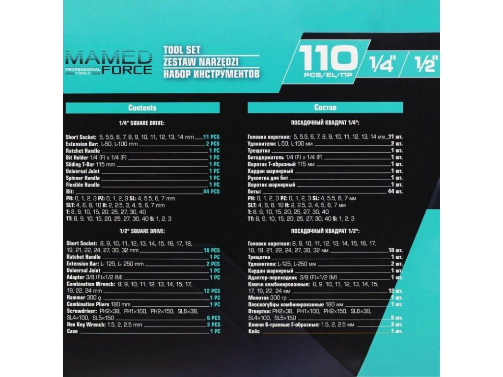 Nabor orodij, ki vključuje 110 delov, je idealna rešitev za profesionalne mehanike in entuziaste popravila avtomobilov. Paket vsebuje raznovrstna orodja, ki zadovoljijo širok spekter potreb. V naboru so prisotni štiriskotni podstavki 1/4" in 1/2".